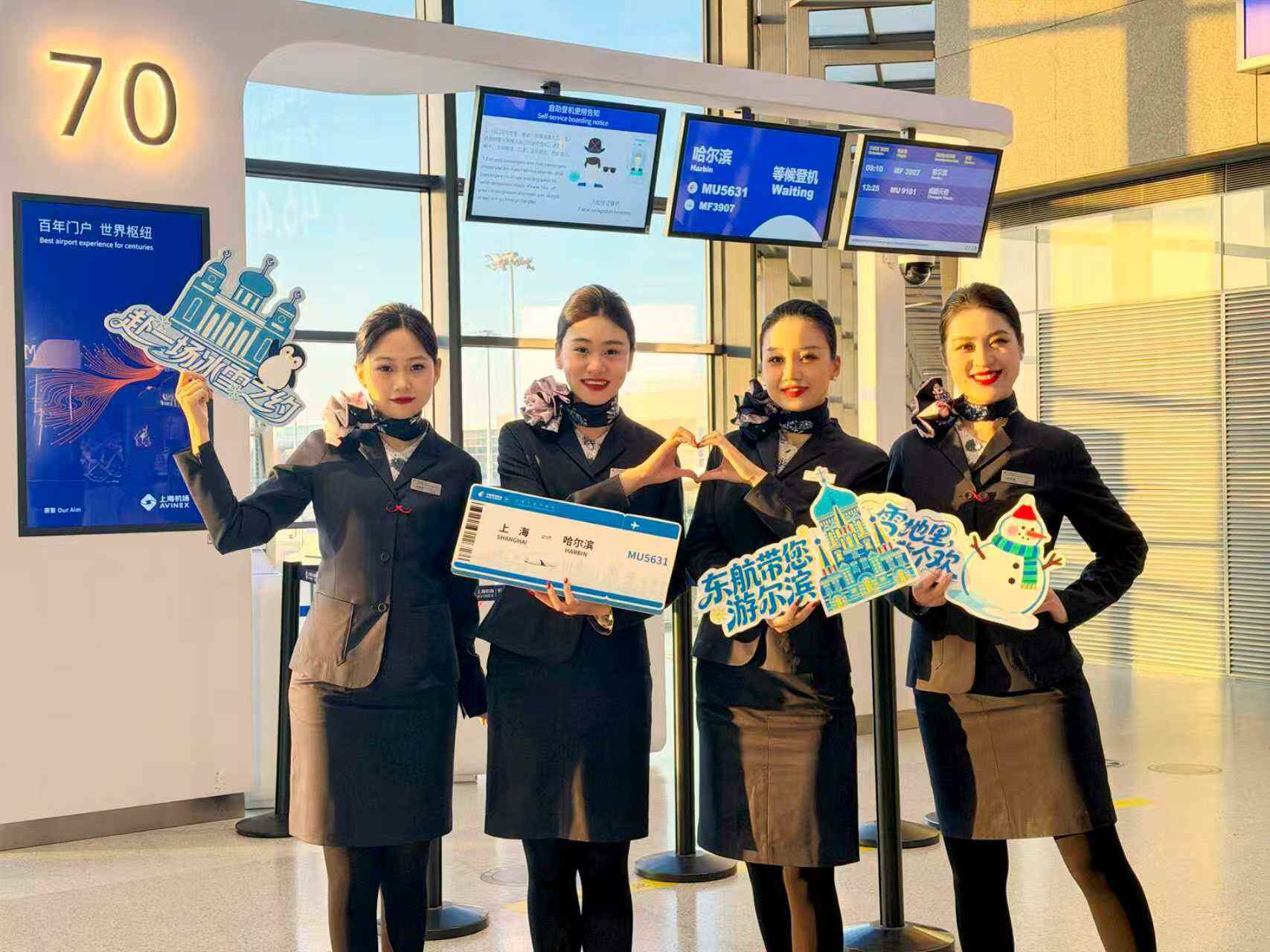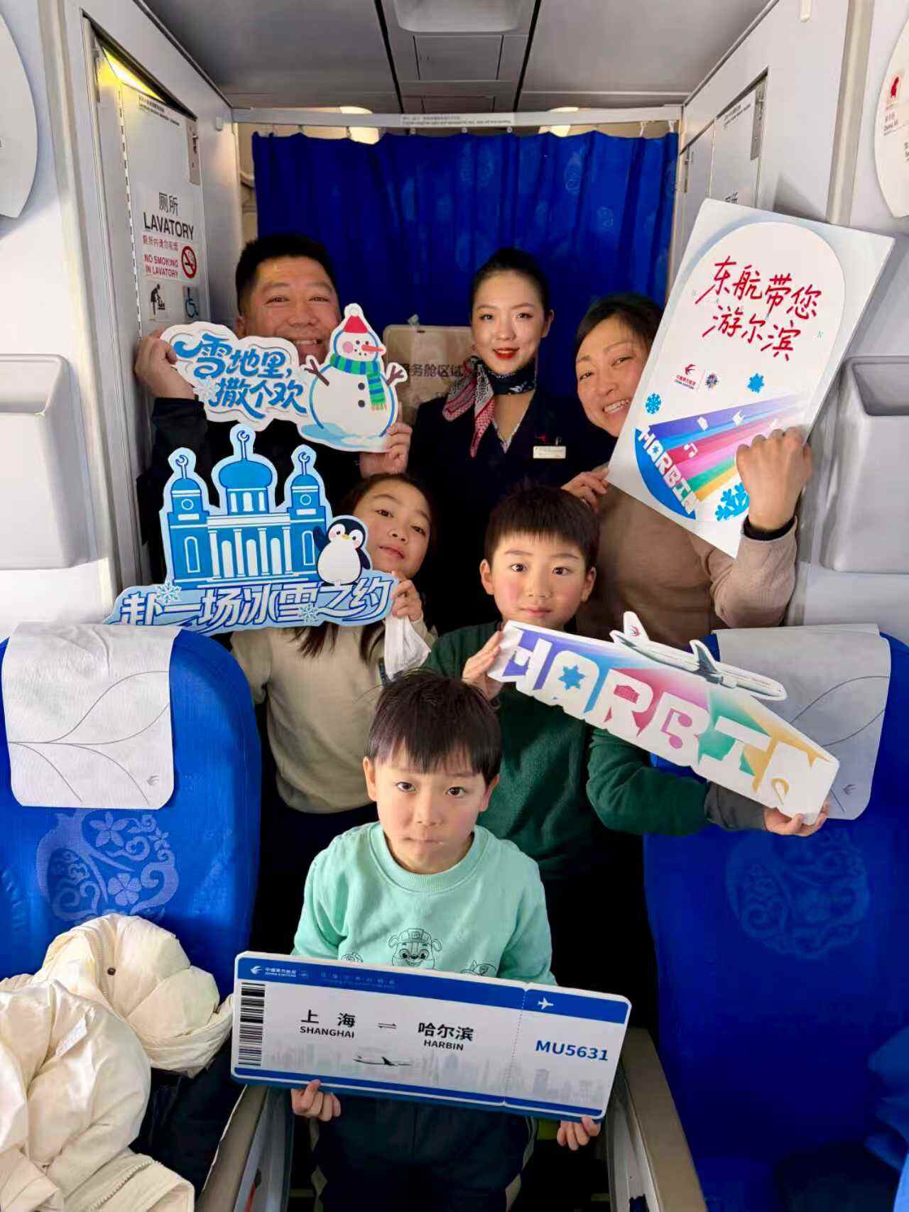 启动仪式当天,东航上海—哈尔滨MU5631航班化身“冰雪主题空中客厅”,机组人员在冰雪特色的飞机客舱内为每位旅客送上专属暖心礼包,包含马迭尔冰棍、玉米杯、红肠等经典东北风味,让旅客在云端提前解锁“尔滨”味觉密码。现场还同步开展景区门票抽奖活动,幸运旅客将免费开启梦幻冰雪之旅,为旅途注入满满惊喜。