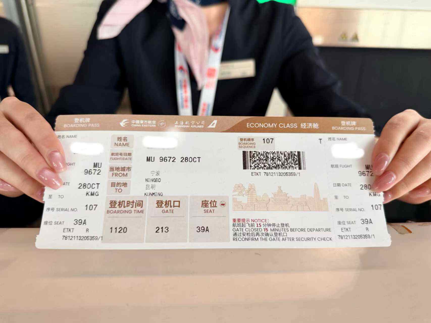 东航在2025创新推出的新登机牌,采用大字体、高对比度设计,清晰标注航班号、登机口、座位号等核心信息,关键信息用醒目色块突出显示,以此解决旅客,特别是老年旅客看不清、找不准信息的困扰。