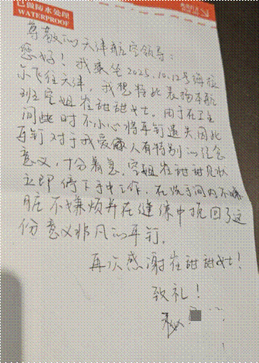 图 旅客手写感谢信