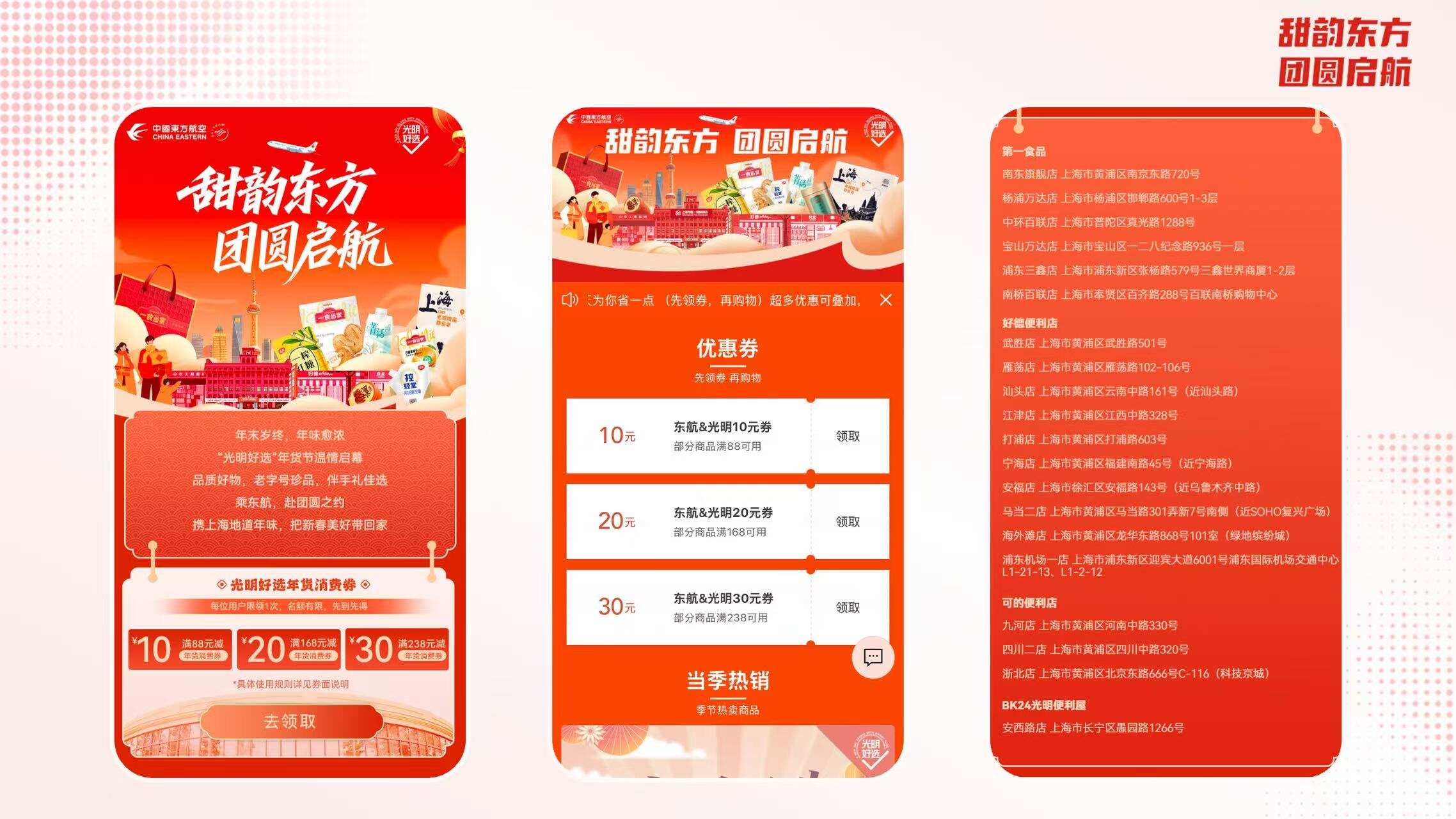 在线上,旅客可通过东航APP、小程序及“光明好选”小程序领取10元至30元不等的满减券,用于在“光明好选”平台购买商品,满58元即可包邮,将心意直送到家。