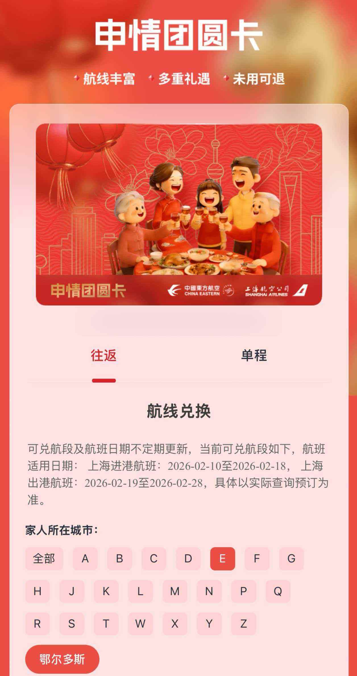新春渐近,东航为特定年龄段旅客推出春节“申情团圆卡”及增值服务产品,单程次卡559元、往返次卡999元,覆盖春运核心时段的上海国内进出港航班。