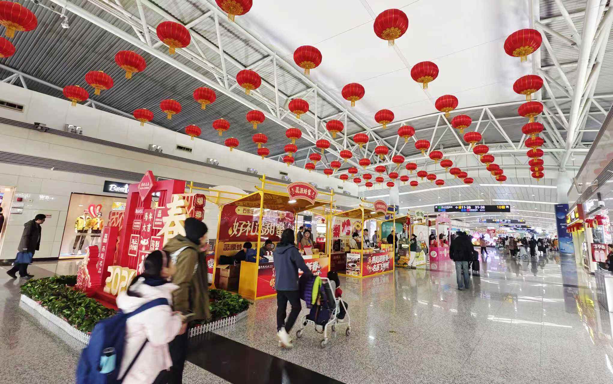 春运期间,机场还将化身充满年味的“新春驿站”。机场巴士内,窗花点缀车窗、中国结悬挂行李架;机场场区高架道路、停车场悬挂“平安回家”“欢迎回家”主题元素景观,1、2号环岛LED屏滚动新春寄语。同时,航站楼也是年味十足,核心动线悬挂 300 余盏灯笼;AB、BC安检通道前“金橘树”“锦绣紫春”景观相映成趣,C值机岛旁“新年许愿”墙成为旅客打卡热点;2、3号门“福马迎新年”主题门头喜气洋洋;值机大厅、候机区、到达夹层的4处主灯笼展示区,同步推出马年专属登机牌,让旅客在便捷出行的同时,邂逅新春惊喜。