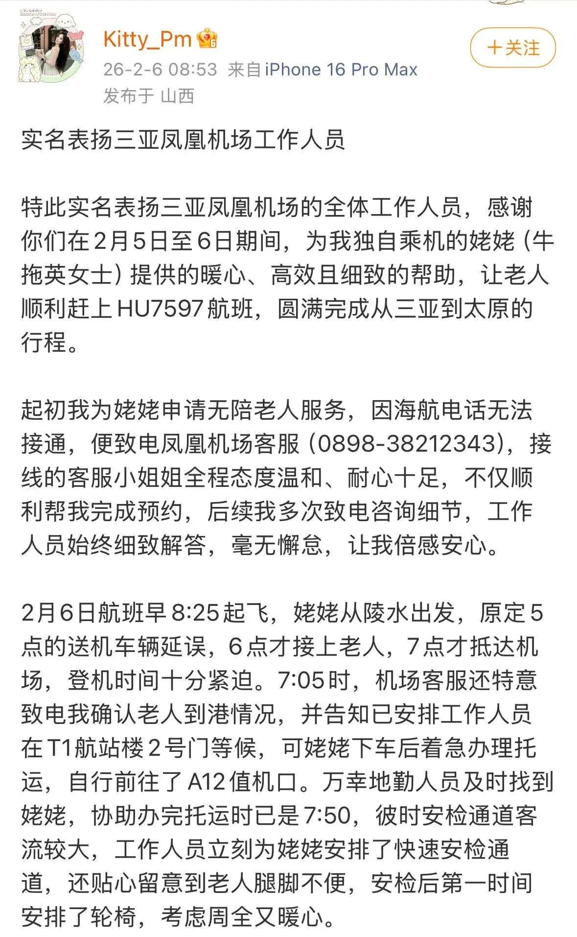 “如果没有你们的全力帮助,独自出行的姥姥定会手足无措、错过航班。你们的专业与暖心,是旅途中最温暖的光!”