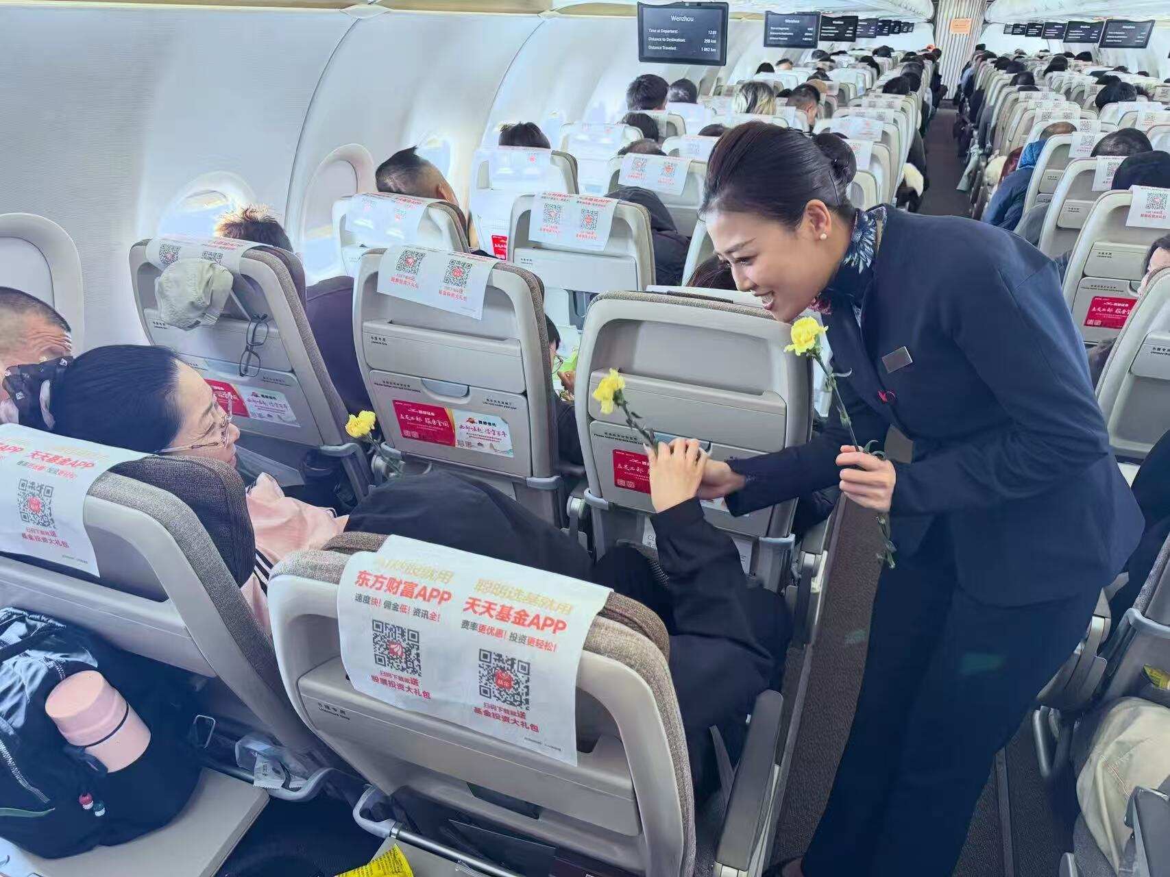 3月8日,在三八国际劳动妇女节当天,东航西北乘务组MU2388南京—西安、MU2392西安—温州、MU9913西安—合肥等多条航线上为女性旅客送上温馨的节日祝福,以质朴心意与贴心服务,为广大出行旅客传递云端温暖。