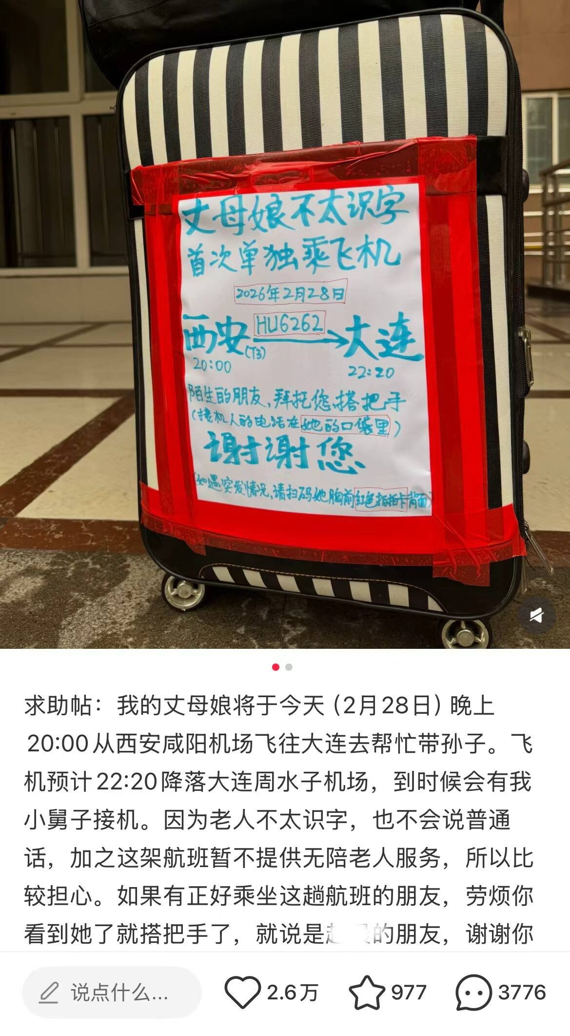 当一位不识字的花甲老人第一次独自踏上航程,当一份来自家属的牵挂与忐忑在网络上传递,一场跨越千里的爱心接力悄然展开。2月28日晚8点,西安咸阳国际机场飞往大连周水子国际机场的HU6262次航班即将起飞,一条“丈母娘不太识字,首次单独乘飞机”的求助帖在社交平台迅速发酵。天南海北的新海航人闻讯而动,自发接力,用暖心服务为老人保驾护航。