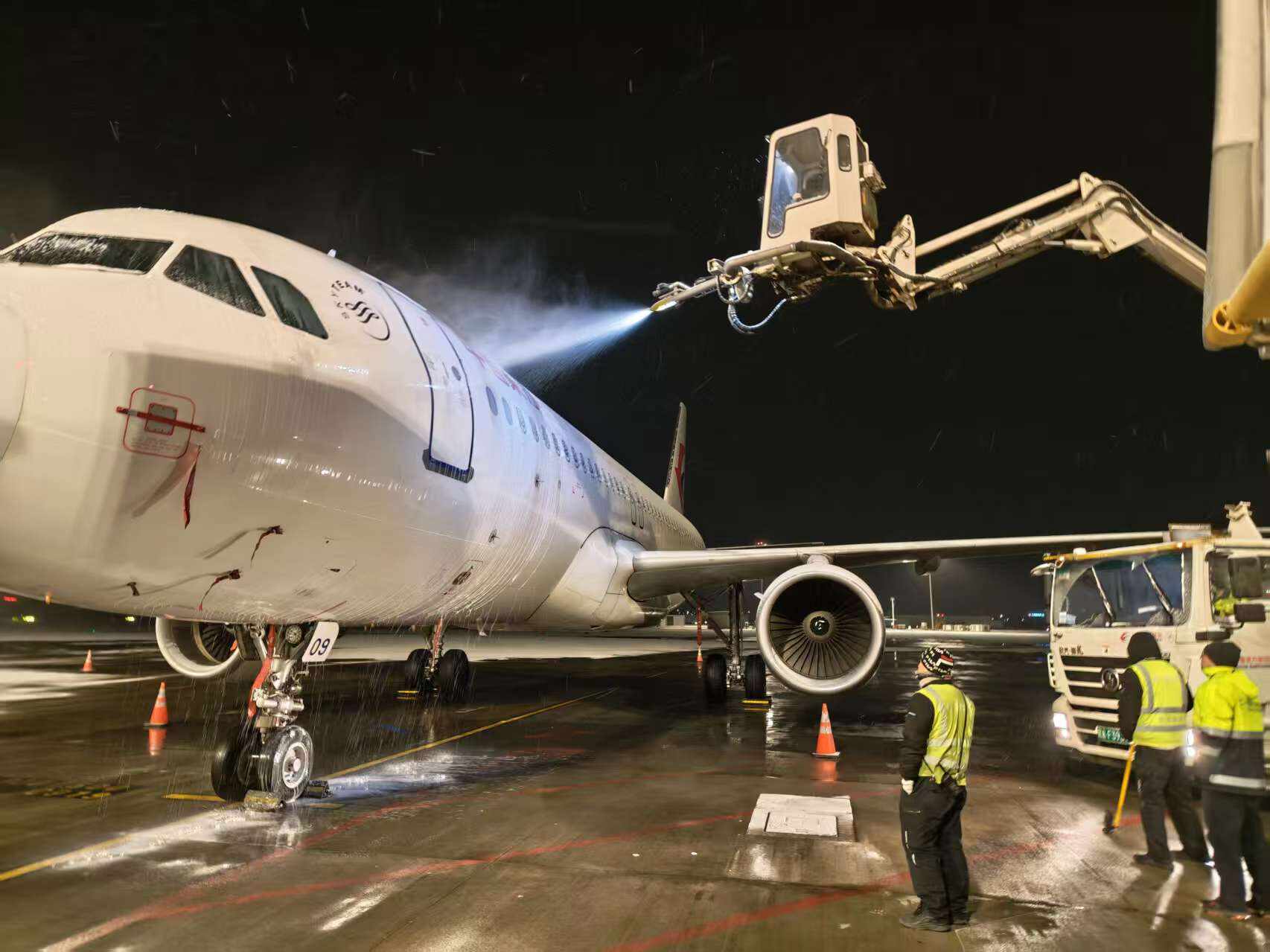 东航甘肃分公司全程密切跟踪天气动态,做到提前部署、靠前准备,全面加强设备巡检维护与应急物资储备,保障除冰液供应充足、各类保障设备工况良好。14日凌晨,航线维修人员顶风冒雪迅速抵达机坪,即刻开展飞机除冰作业。大家熟练操控除冰设备,细致清理机身表面积雪,确保飞机表面洁净无残留、完全符合适航标准。