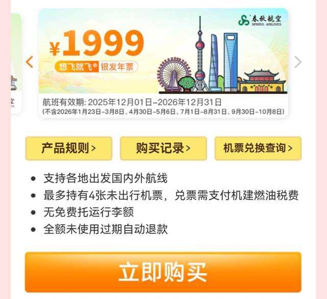 春秋航空2026版春夏“想飞就飞”系列产品全新升级。此次全新升级产品于3月18日11:00在春秋航空官方APP/小程序及京东旗舰店开放销售。分为单人版和亲子版,单人版定价1999元,亲子版定价2999元。可兑换航班日期为2026年3月29日至2026年6月18日,其中2026年4月30日至2026年5月6日不可使用,清明假期及部分地区学生春假已涵盖在内,航班有效期合计75天。航班有效期内可不限次乘坐所有春秋航空执飞国内(含港澳台)非包机航线,合计近500条。覆盖石家庄出发的各类航点,如上海、广州、成都、三亚、厦门、乌鲁木齐、桂林、伊宁等热门航点,及泉州、西宁、通辽等小众旅游地。此款产品为两地探亲、商旅出行、家庭旅游的旅客提供便利。值得一提的是:春秋航空2026版春夏“想飞就飞”套票在继续保留提前3天免费兑换、未用随时可退、未回本退差价等核心权益的同时,开展了社群预约提前购,飞行挑战得托运行李券、积分、90天金卡权益等活动。