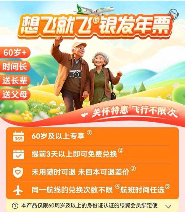 春秋航空针对银发旅客,推出60岁及以上专属的“想飞就飞银发年票”。该年票定价1999元,1999元可无限次兑换春秋航空国内外执飞航线(包机航线除外),涵盖康养、文旅、境外等目的地,航班适用日期为2026年3月9日至12月31日(部分高峰时段不可用),还配套灵活退改权益。自上线以来,春秋航空套票旅客中60岁+长者占比从4.7%跃升至17.2%,不少爱旅游的年长旅客已使用该产品,飞了30多次,切实惠及众多老年群体。