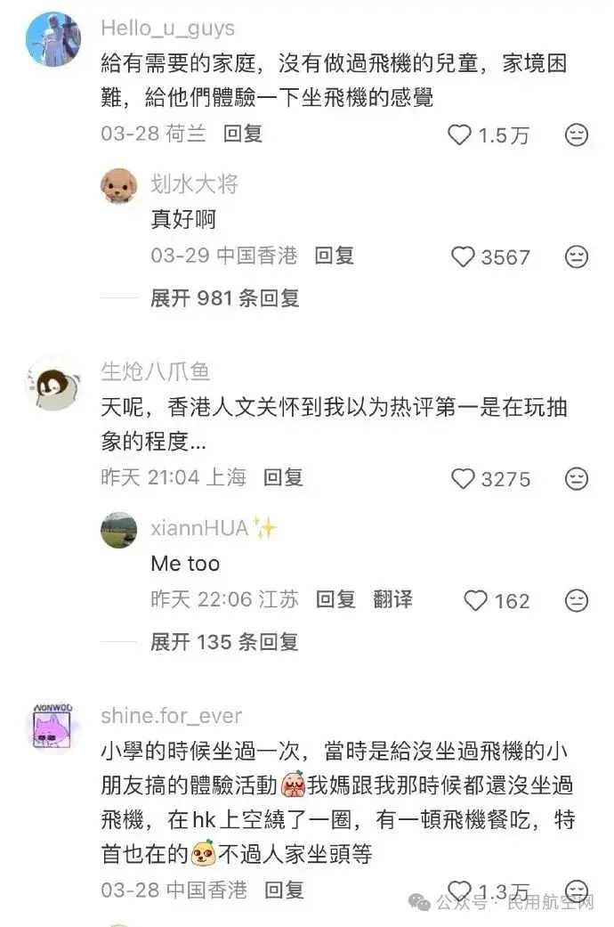更具温度的是,部分班次为公益性质,由航司与公益机构合作,面向重症病童、残障人士及困难家庭提供免费体验,完整还原乘机流程与机上餐食服务,为无法长途出行的群体圆飞行梦。此外,新机试飞、机组资质训练、维修后验证飞行等专业任务,也会以香港往返香港的形式呈现,属于民航业常规操作。