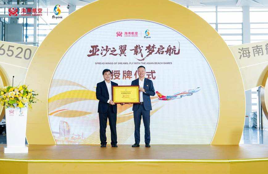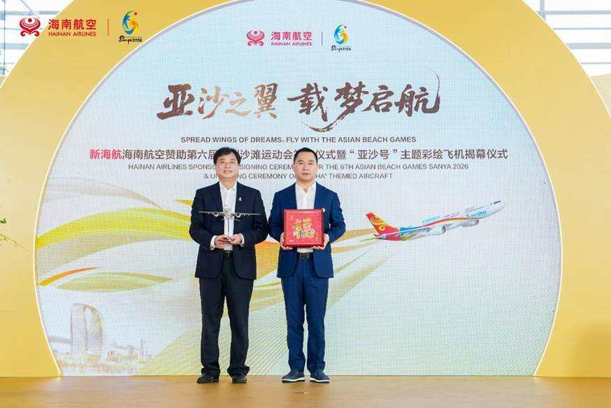 2026年4月11日,三亚—本报讯:(通讯员 杨映娟 作者单位:海南航空控股股份有限公司)——4月11日上午,三亚凤凰国际机场新候机楼内,新海航旗下海南航空与第六届亚洲沙滩运动会(以下简称“三亚亚沙会”)执行委员会隆重举行赞助签约仪式暨“亚沙号”主题彩绘飞机揭幕仪式。活动以“亚沙之翼,载梦启航”为主题,标志着海南航空正式成为第六届亚洲沙滩运动会官方高级合作伙伴,并面向海内外盛大发布首架三亚亚沙会主题彩绘飞机。亚沙会组委会副秘书长、执委会副主任兼秘书长、三亚市副市长张长丰,崖州湾国家实验室主任助理夏树,中国人民解放军总医院海南医院副政委、纪委书记王会浦,亚沙会执委会市场开发部常务副部长、三亚市投资促进局党委书记叶凯中,海航航空集团党委书记高建,海南航空总裁余超杰,海南航空党委书记桂海鸿,以及媒体记者代表等各界嘉宾齐聚一堂,共同见证这一具有里程碑意义的重要时刻。