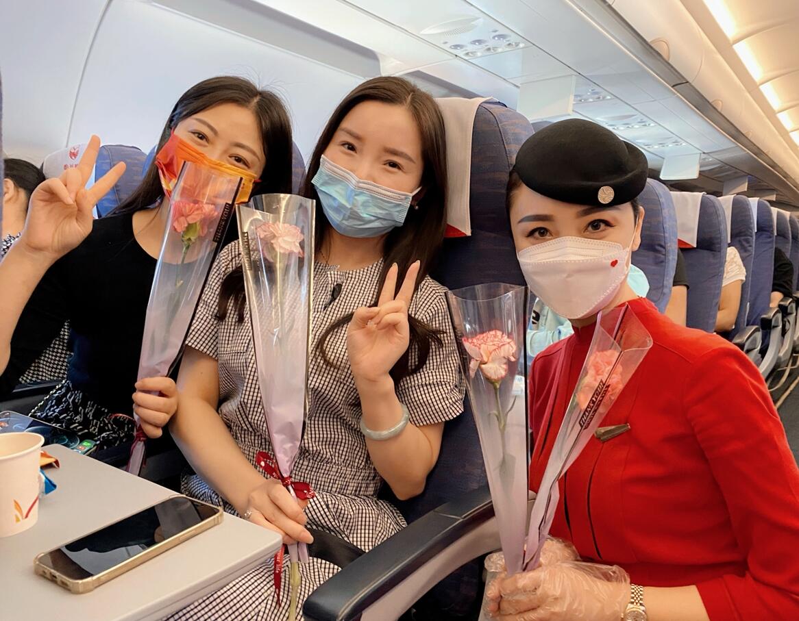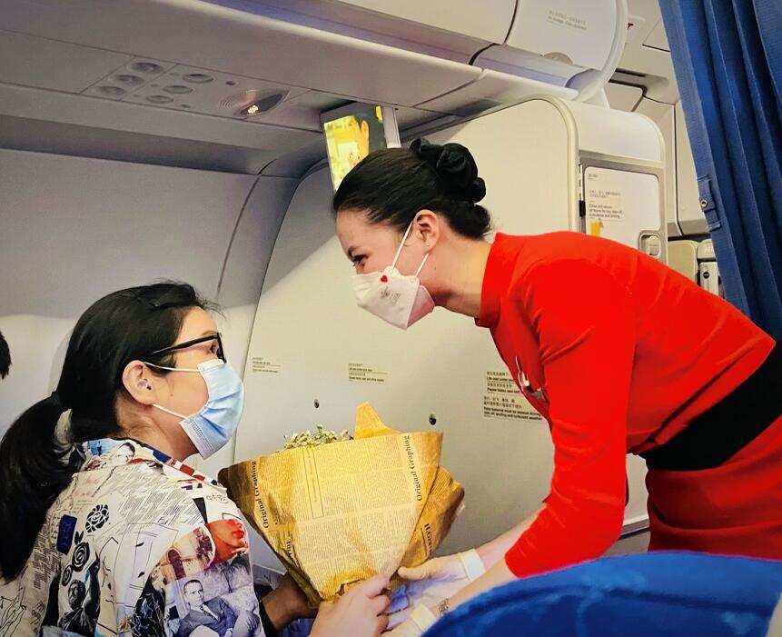 3U8963成都-上海航班上,已有10年飞行经验的乘务教员张熙喆与徒弟陈美娟在特别安排下重聚。