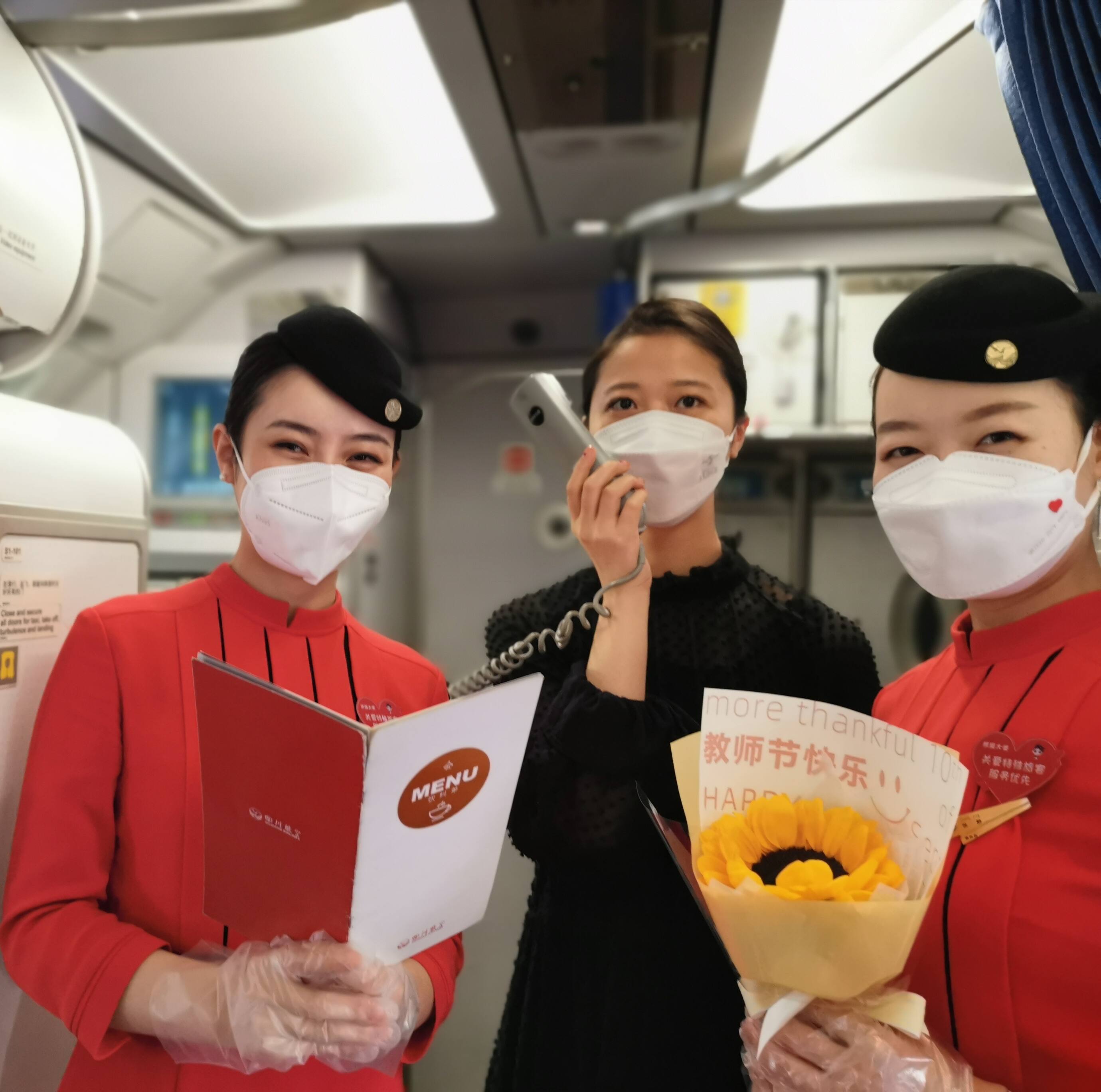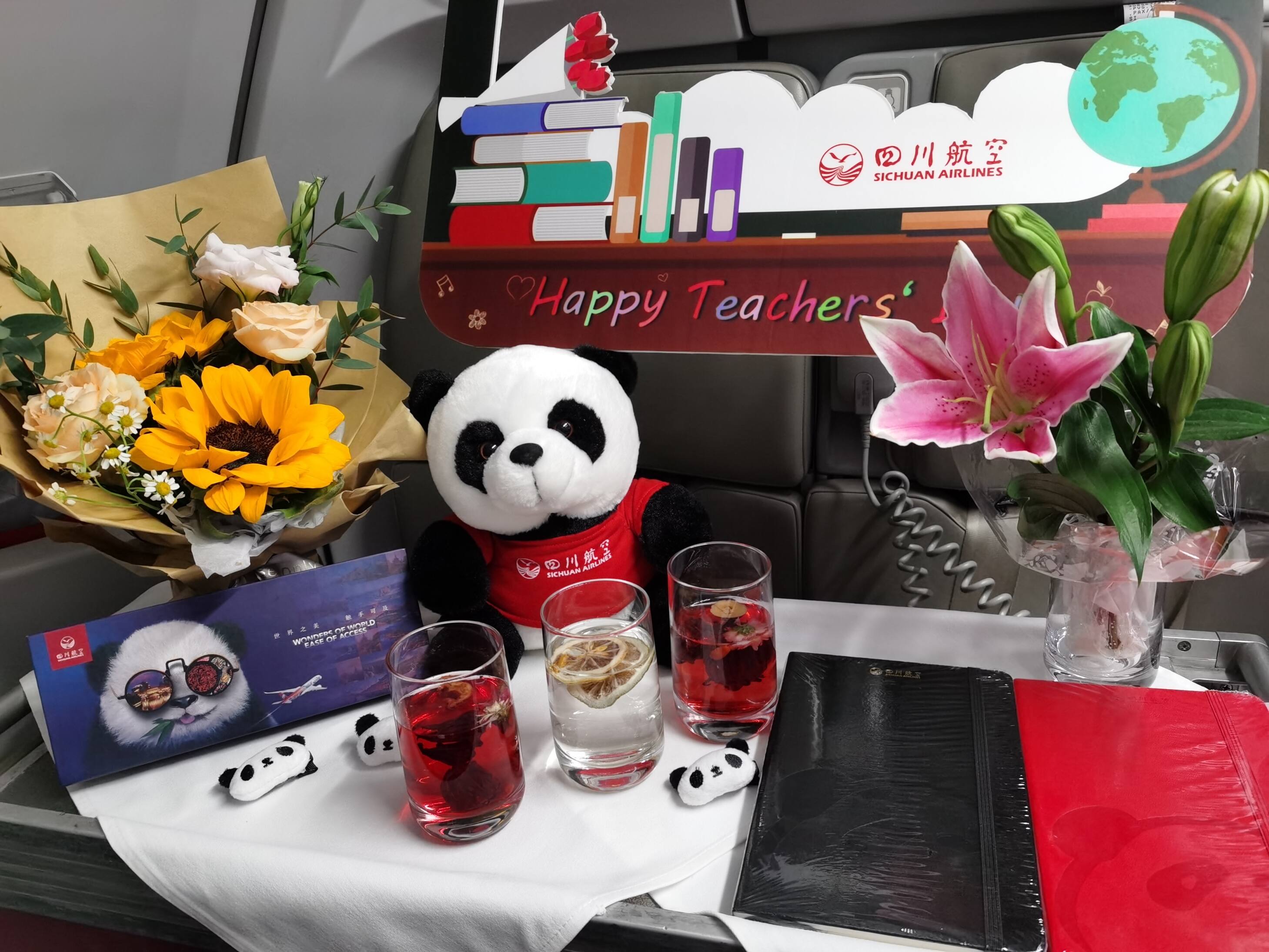 9月9日,在第37个教师节来临前夕,四川航空在成渝昆三地飞往上海、沈阳、无锡、济南等17个航班上,推出以“美丽川航 蓝天师生情 真情满客舱”为主题的教师节航班,邀请旅客分享难忘的师生故事,向职业为教师的旅客赠送纪念品,并安排了5对乘务员师徒在蓝天重聚。