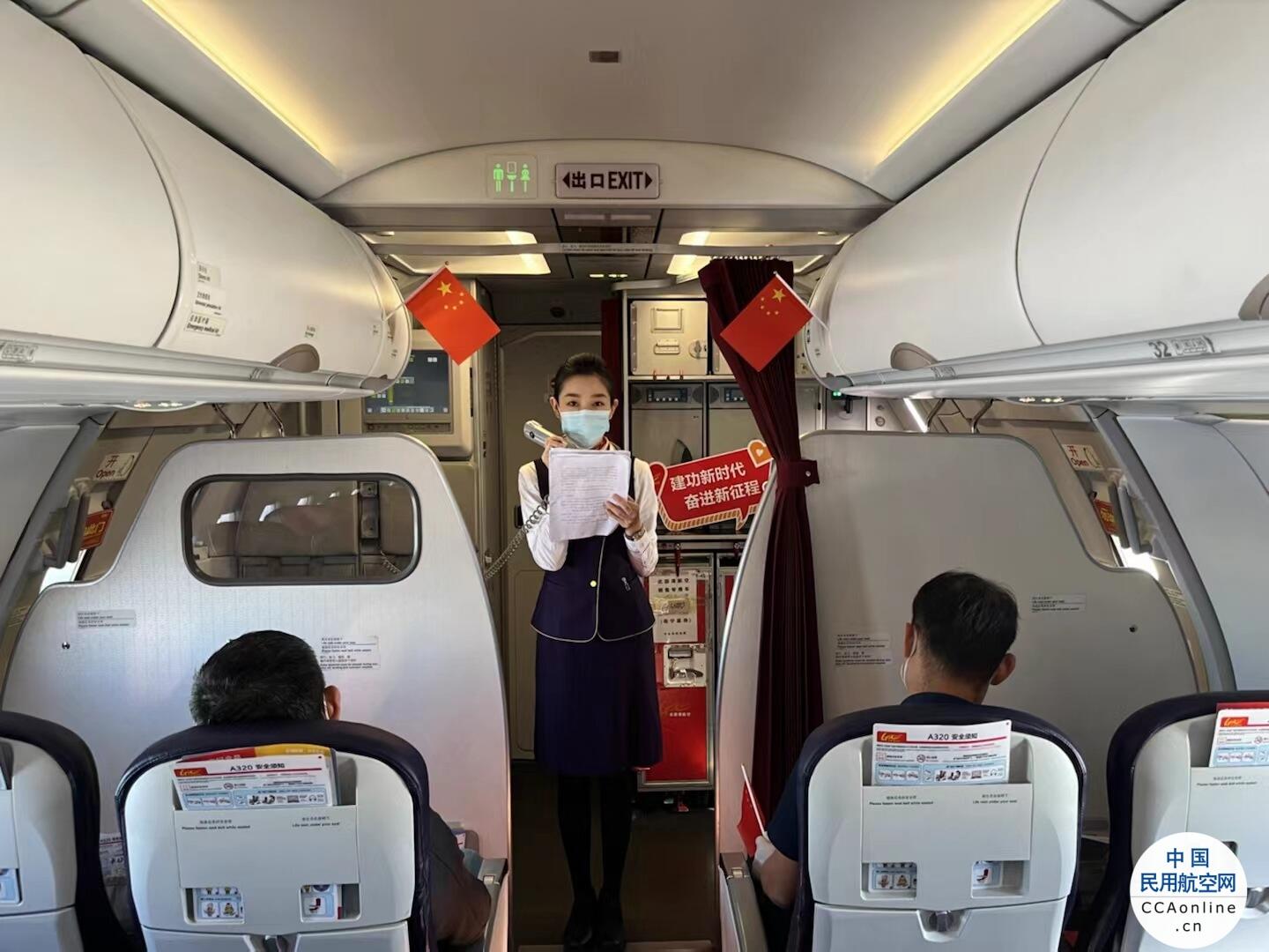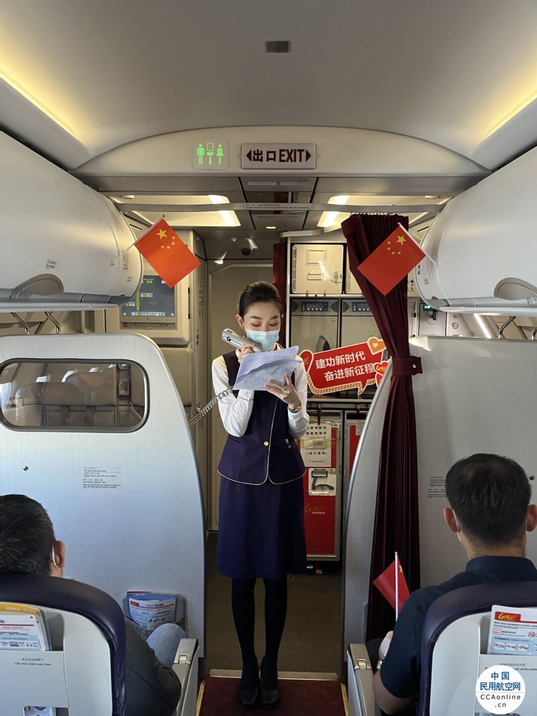 在航班餐饮服务结束后,客舱活动在乘务长高琪琪为旅客介绍党的二十大的主题中拉开了序幕,“党的二十大的主题为:高举中国特色社会主义伟大旗帜,全面贯彻新时代中国特色社会主义思想,弘扬伟大建党精神,自信自强、守正创新,踔厉奋发、勇毅前行,为全面建设社会主义现代化国家、全面推进中华民族伟大复兴而团结奋斗。”随后,“青秀党员示范组”还为广大旅客准备了党史知识有奖竞猜、爱国诗词朗诵等互动环节,鲜活的党史故事、感人的爱国情怀让旅客的旅途充满意义。旅客们积极举手抢答,大家学习党史的热情高涨。