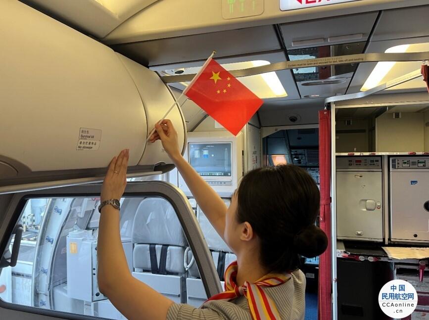在迎客阶段乘务员为旅客分发小国旗,营造出喜悦、欢快的节日氛围。