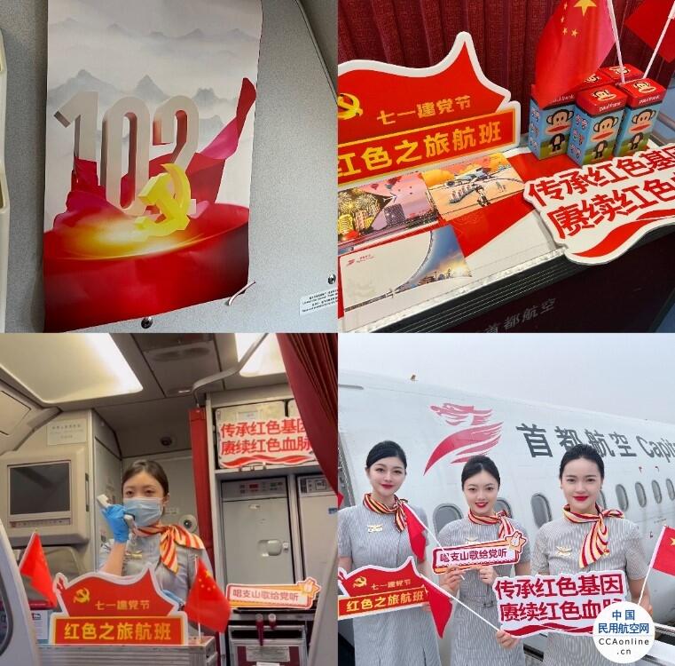 首都航空的乘务员们上飞机后粘贴海报、插小红旗,粘贴“党员先锋岗”精心装点客舱环境,乘务组还准备了分享《红岩》读后感、安全知识问答互动、合唱红歌庆党生日、旅客乘机感受分享等互动环节,在万米高空共同为党庆生日。