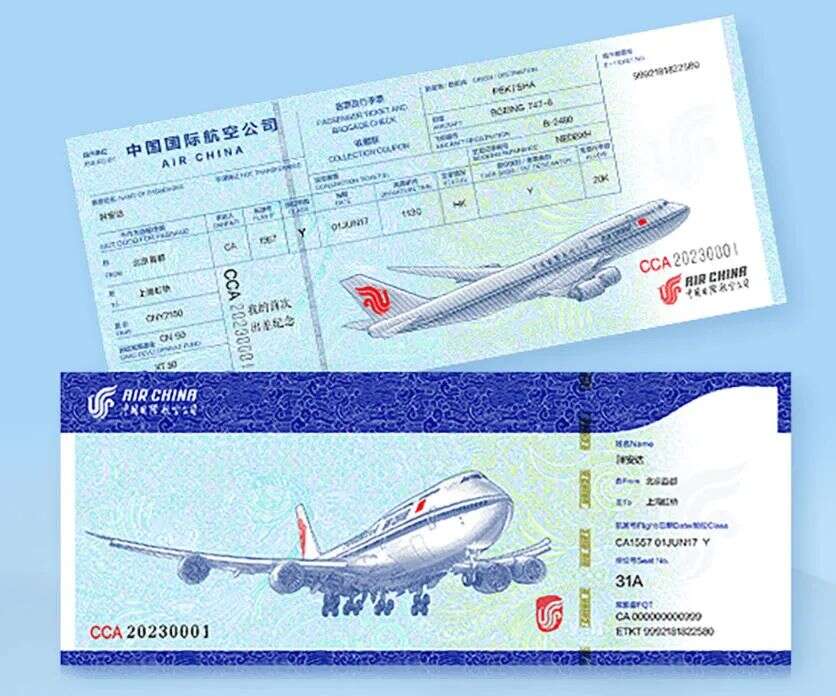 这款机票由国航出品、中国印钞造币集团有限公司承制,使用全新高清水印钞券纸,制作工艺上采用高触感手工凹印工艺,带有独特钞券设计和防伪印制技术,在紫光灯下,票面上的飞机舷窗和机翼两端的飞行导航灯会有“点亮”效果。