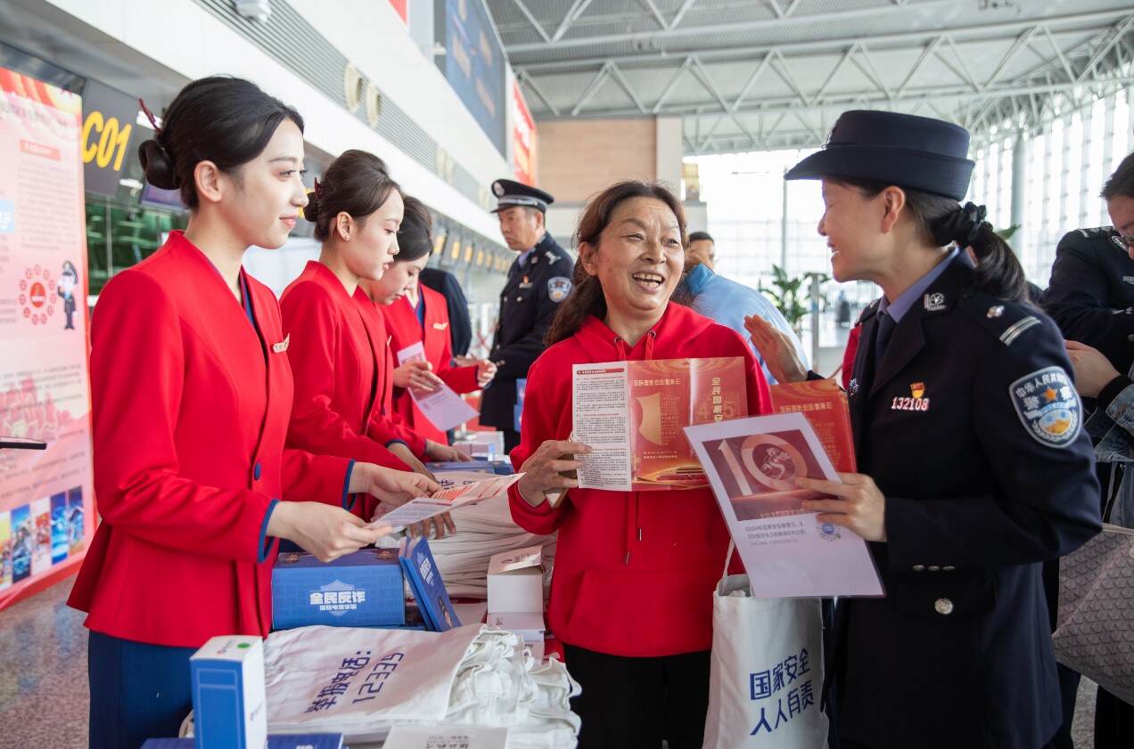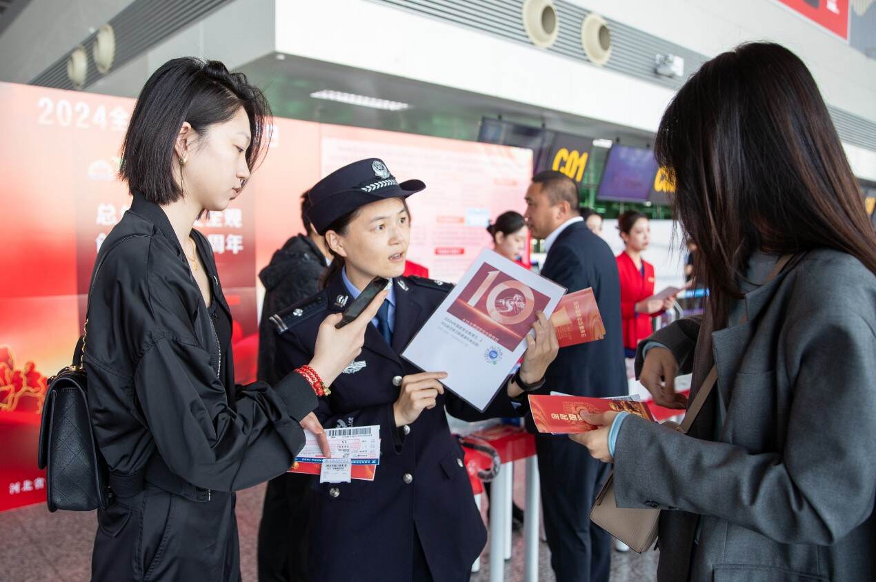 中国民用航空网讯|(通讯员 王凯 王瑾璐)“您好,我们是移民管理警察。今天是第9个全民国家安全教育日,让我们一起学习国家安全知识。”今年是总体国家安全观提出10周年,4月15日,石家庄出入境边防检查站与河北省公安厅机场公安局、河北航空有限公司在石家庄正定国际机场T2航站楼共同开展国家安全教育日普法宣传活动。