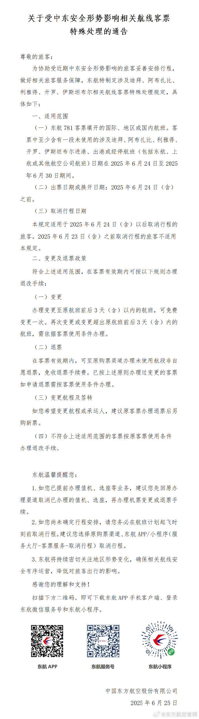 为协助受近期中东安全形势影响的旅客妥善安排行程,做好相关旅客服务保障,东航特制定涉及迪拜、阿布扎比、利雅得、开罗、伊斯坦布尔相关航线客票特殊处理规定,具体如下: