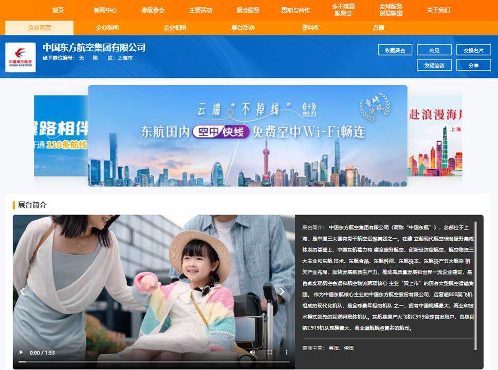 作为全球服务贸易领域规模最大、影响力最广的综合性展会,服贸会为国内外企业搭建了对接全球资源、共享市场机遇的高端平台,为世界经济发展和全球服务贸易注入活力。中国东航积极投入线上展台的搭建工作,精心设计线上展台布局,设置了“公司简介”“形象广告”“宣传片展映”“产品与服务”等多个模块,以全面且富有创意的展示,在服贸会这个开放合作平台上,展现东航企业形象和多元化服务产品。