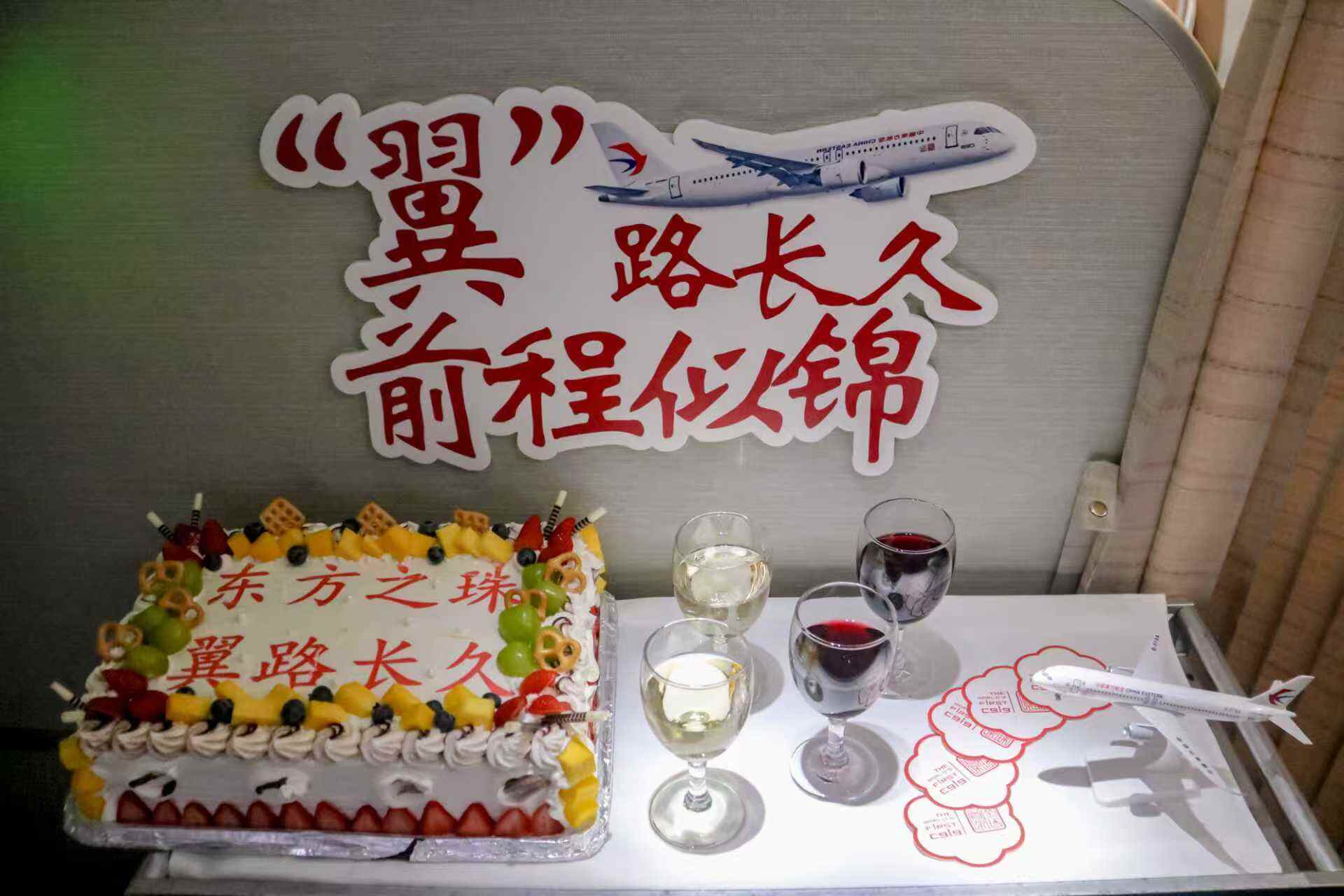 飞机进入平飞阶段后,乘务组邀请座位号为“9”和“19”的两位幸运旅客,一同切开写有“东方之珠 翼路长久”的纪念蛋糕。随后,通过一段温情洋溢的机上广播,乘务组深情讲述了C919名字中“9”与“19”所承载的美好寓意,回顾了东航作为C919全球首发运营商两年以来所取得的成绩。