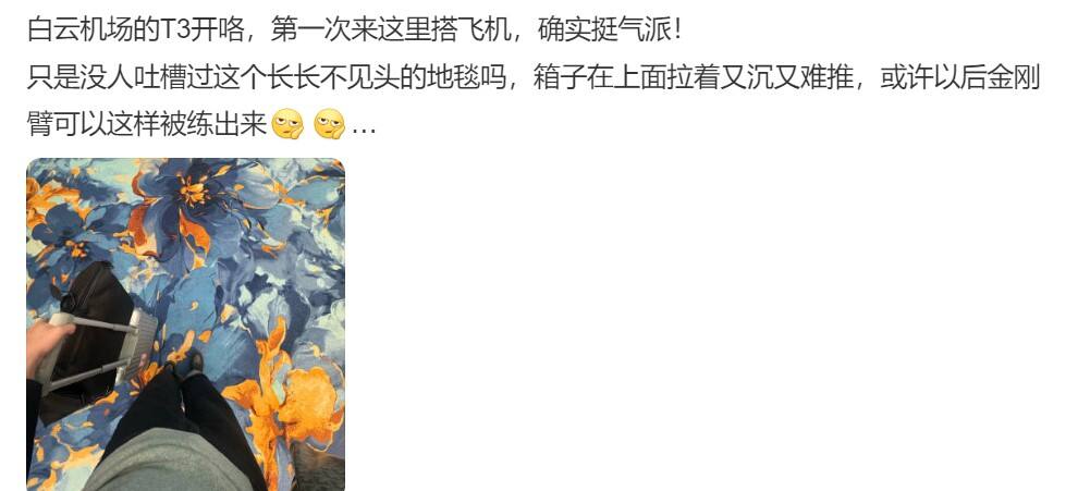 也有网友表达了对新航站楼地毯的好感,称地毯“审美在线”“高级感满满”。