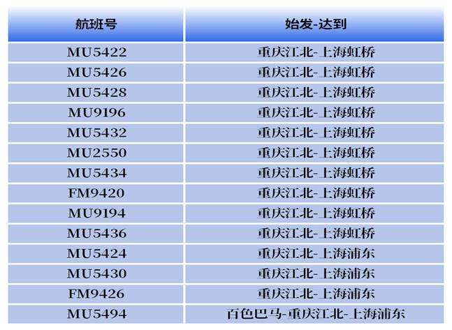 (注:经停其他城市到上海的航班不属于沪渝快线,如MU5440 重庆-信阳-浦东等航班)