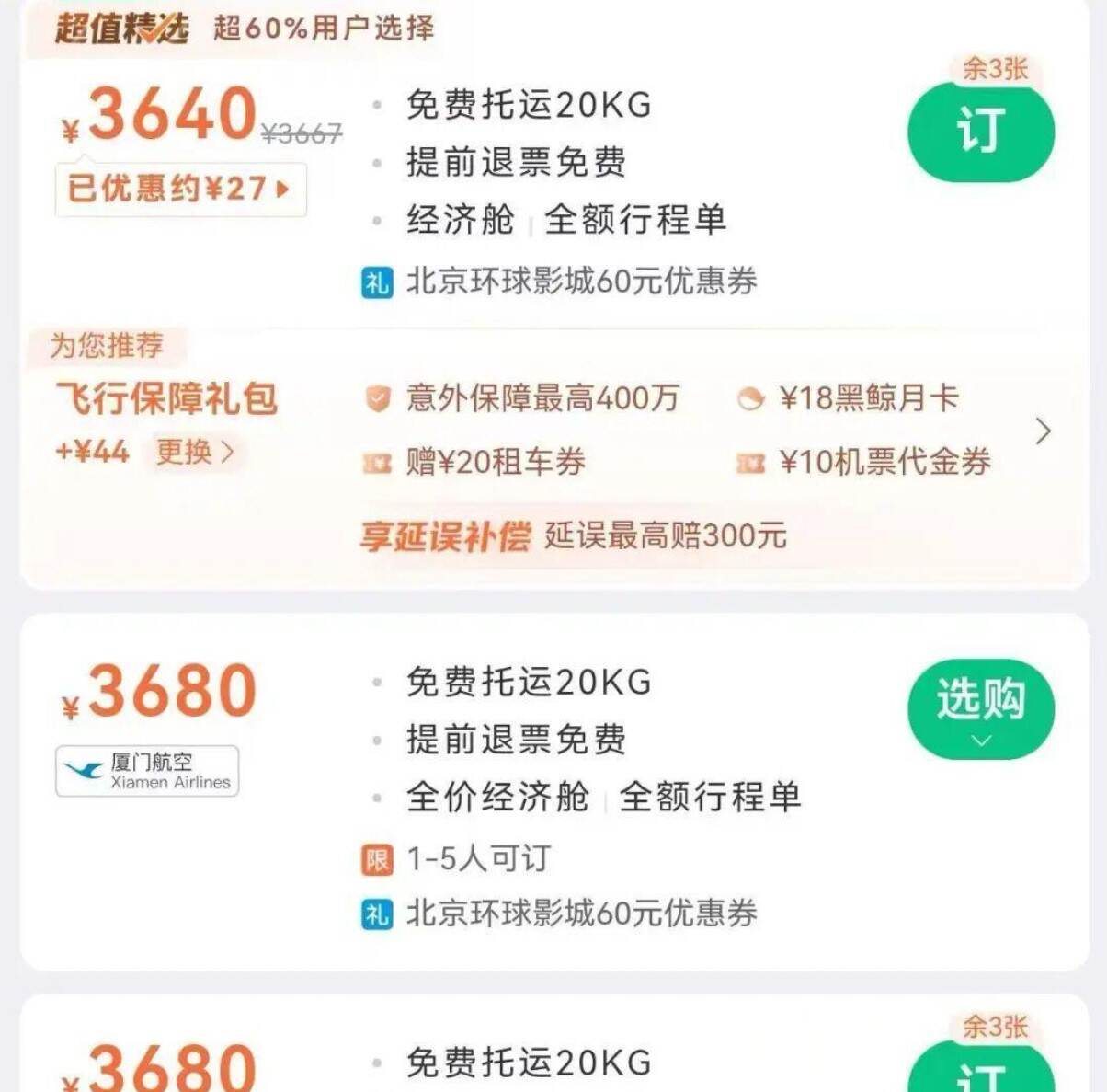例如记者在另一购票平台查询了一趟从三亚到北京的机票,排名第一的选项价格为3640元,“订票”按钮的设置与价格平行,在一条分隔线下方写着“为您推荐飞行保障礼包”,看起来这是一个需要额外点击才会购买的独立选项,但实际上这也是一个捆绑销售的套餐产品。