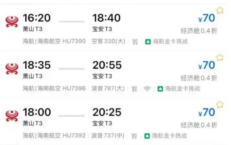 1月9日,据社交平台部分网友反映,海南航空部分热门航线机票价格出现明显异常,价格低至几十元。其中,杭州至深圳的经济舱票价仅为0.4折,约70元;广州至北京的机票价格也仅为100多元,远低于正常水平。