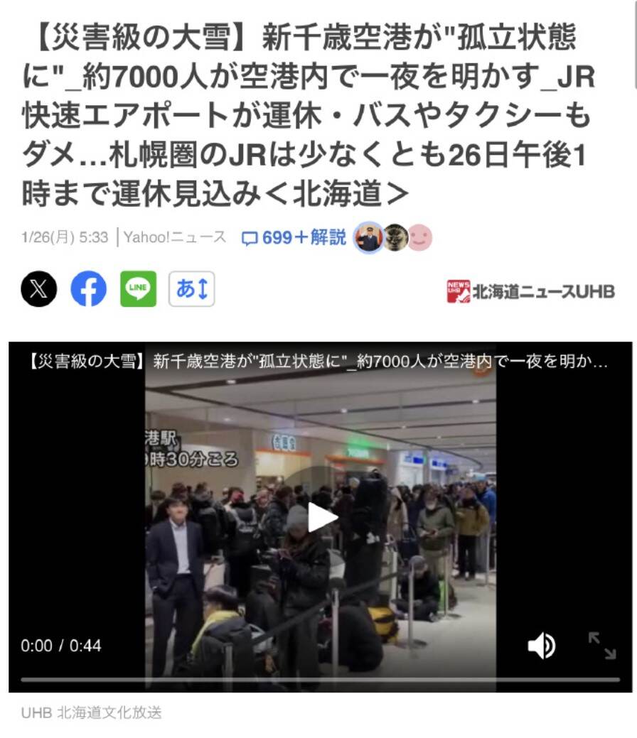 此次暴雪正值中国春节假期,许多赴日旅游的中国游客受影响。社交媒体上,多位中国网友发文描述困境: