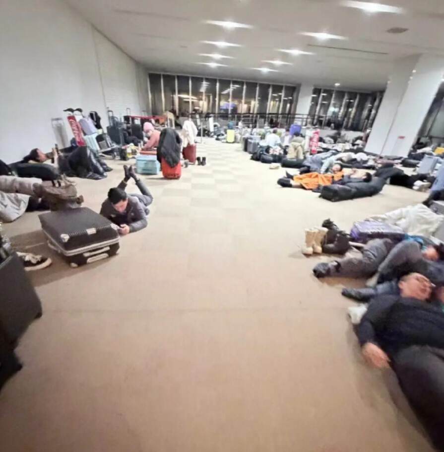 面对滞留旅客,机场方连续两晚开放航站楼内部区域作为临时避难所,向旅客分发被褥、饮用水等物资。然而,航站楼内仍人满为患,许多旅客不得不席地而睡。