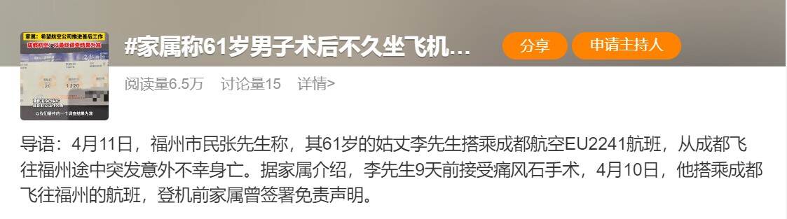 据家属介绍,逝者李先生系福州人,事发9天前在成都接受了痛风石切除手术。4月10日,李先生搭乘成都航空EU2241航班返榕,该航班计划于12时50分从成都双流机场起飞,15时40分抵达福州长乐机场,实际起飞时间为13时43分,15时51分抵达目的地,全程飞行约2小时8分钟。登机前,因李先生属于术后旅客,家属按航司要求签署了《风险告知确认书》(免责声明),以为已尽到相关告知义务,未料途中发生意外。