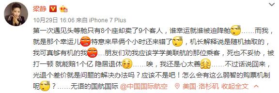 梁静在微博中写道:“第一次遇见头等舱只有8个座却卖了9个客人,谁幸运就谁被迫降舱,而我,就是那个幸运儿特意来早俩个小时还来错了。机长解释说是随机抽取的,我可真够有机的我…朋友们劝我应该学学美联航的那位乘客,死也不妥协,被打一顿就能赔1个亿隐居退休。唉,我还是心太善,不过话说回来,光退个差价就是问题的解决办法吗?应该不是吧!怎么会有这么弱智的购票机制呢?无语的国航国际! ”