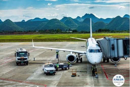 清晨,阳光透过云缝,穿过高耸的石山,照亮了贵阳机场的停机坪。一排停放整齐的E190喷气客机旁边,工作人员来回穿梭,迎来又一个忙碌的飞行日。