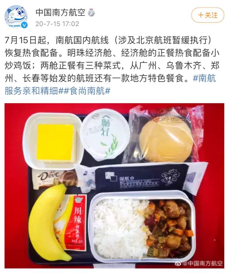 南航曾将毛巾调整为湿巾,餐单、酒水单停止配备,直到去年7月15日才再次恢复部分国内航班的机上热食。