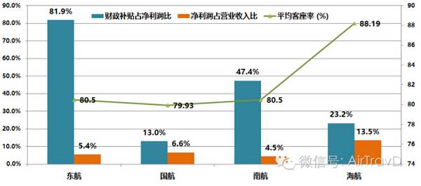 而事实上,2015年几大航空公司的年报数据,也在一定程度上反映了上述的推测。四大航空集团中,除国航外,其它航空公司从政府获得的财政补贴总额都占其净利润的20%以上,高者还是达到了47.4%和81.9%。即使是像春秋与吉祥这样的民营航空,也同样拥有较高的份额,譬如春秋航空,在2014年的比重就达到近70%。
