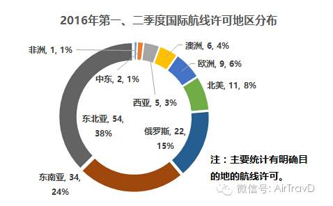 2016年的国际航线开辟情况,与2015年相比,并没有出现明显的转变,但与国家“一带一路”的战略构想联系却明显紧密。西亚航线、俄罗斯航线的开辟步伐明显加快,在2016年上半年获得许可的国际航线数量中,占有18%的份额(西亚,3%;俄罗斯,15%)。而且,这些航线主要集中在北京、上海与广州等一线机场,分别为55%和40%。