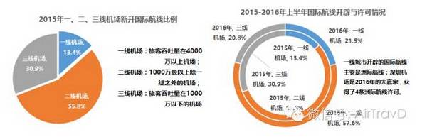 然而,在国际航线数量大幅增长的背后,是市场的快速分化。一线城市机场国际航线开辟数量远低于二、三线城市机场数量。以2015年为例,一线机场开辟的国际航线数量仅占总量的13.4%,二、线城市开辟的国际航线数量份额分别达到了55.8%和30.9%。这种状况,在2016年继续重演,从上半年获得的航线许可情况来看,二、三线城市机场获得的国际航线许可份额分别达到了57.6%和20.9%。