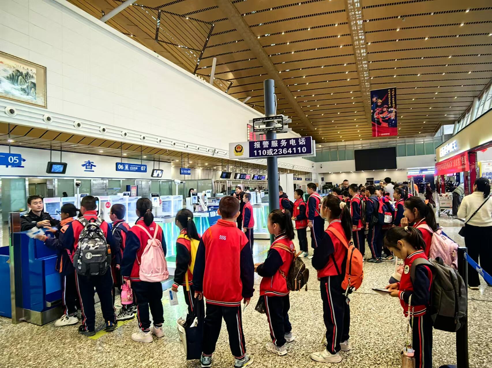 “请各位小朋友们依次排队,手拿自己的登机牌依次登机”。儿童研学团小队员们穿着整齐划一地服装,在机场工作人员的引导下,依次登机,开启美好的学习之旅。“进入廊桥后慢点走,不要奔跑,小心脚下”登机口工作人员一边验证机票一边对小朋友们提示道。伴随着机器的提示音,小朋友们满怀笑容地依次进入登机口,开启研学之旅。
