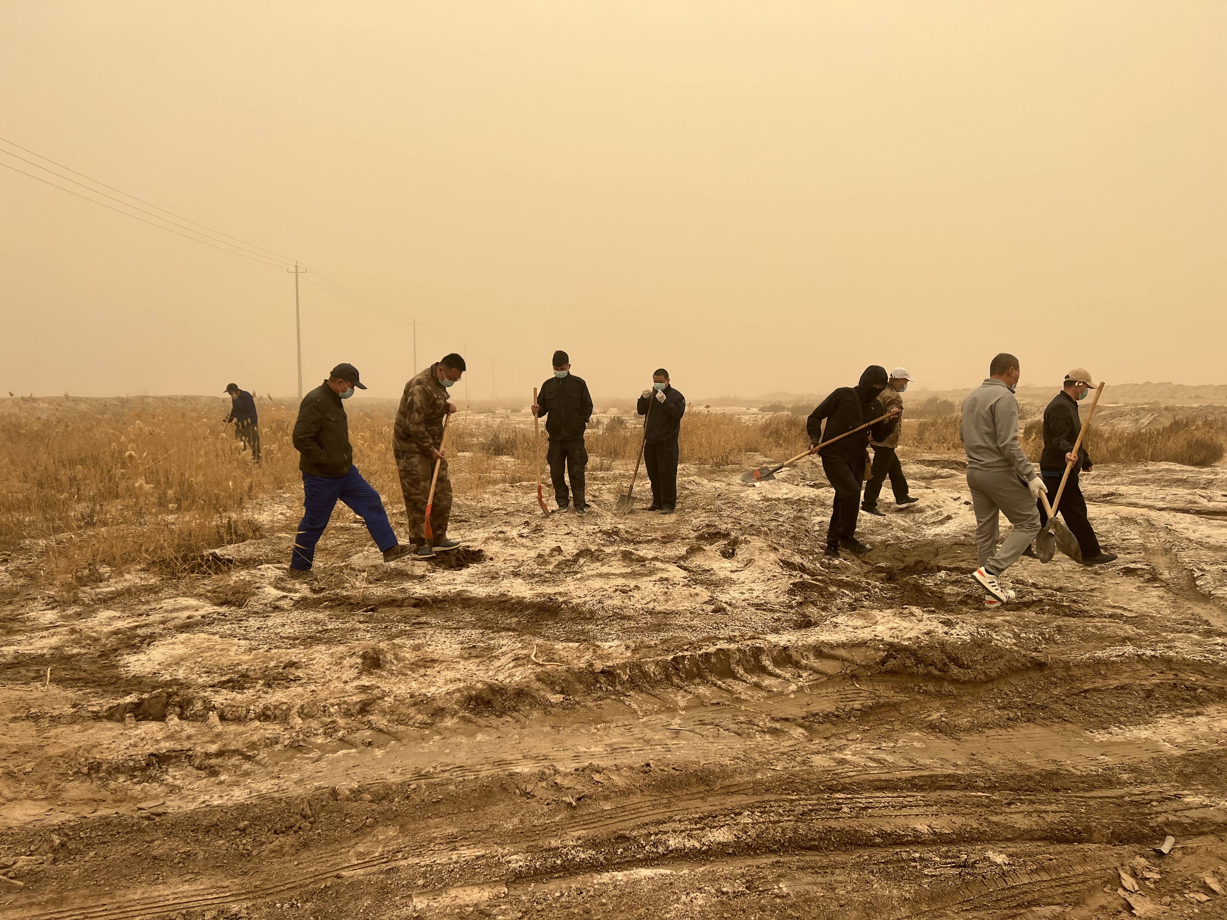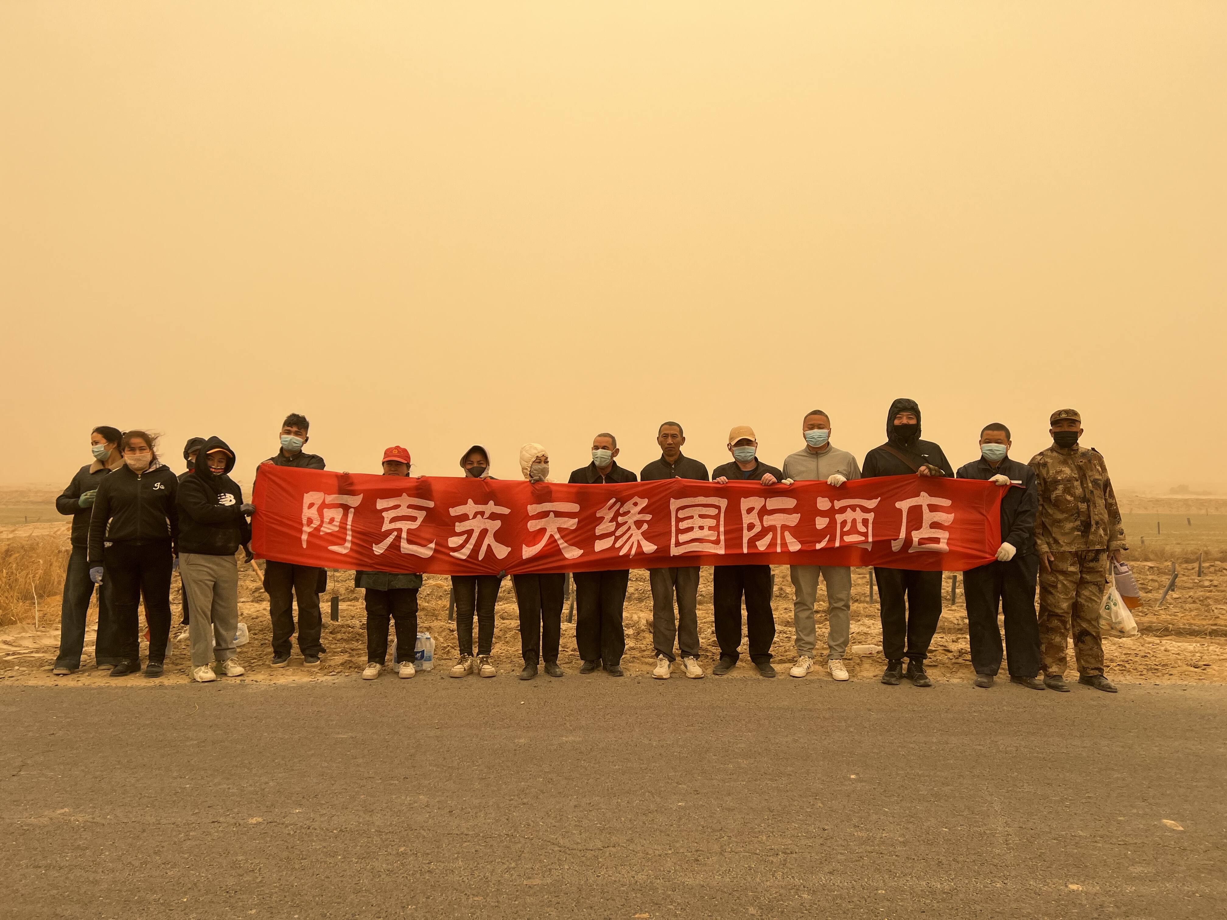 活动当天,志愿者们早早来到植树地点,迅速投入到植树工作中。他们分工明确,有条不紊地进行着树苗的栽种。在漫天黄沙中,志愿者们忙碌的身影构成了一道独特的风景线。大家齐心协力,挥锹铲土、扶苗填坑,每一个步骤都认真细致,确保每一棵树苗都能茁壮成长。