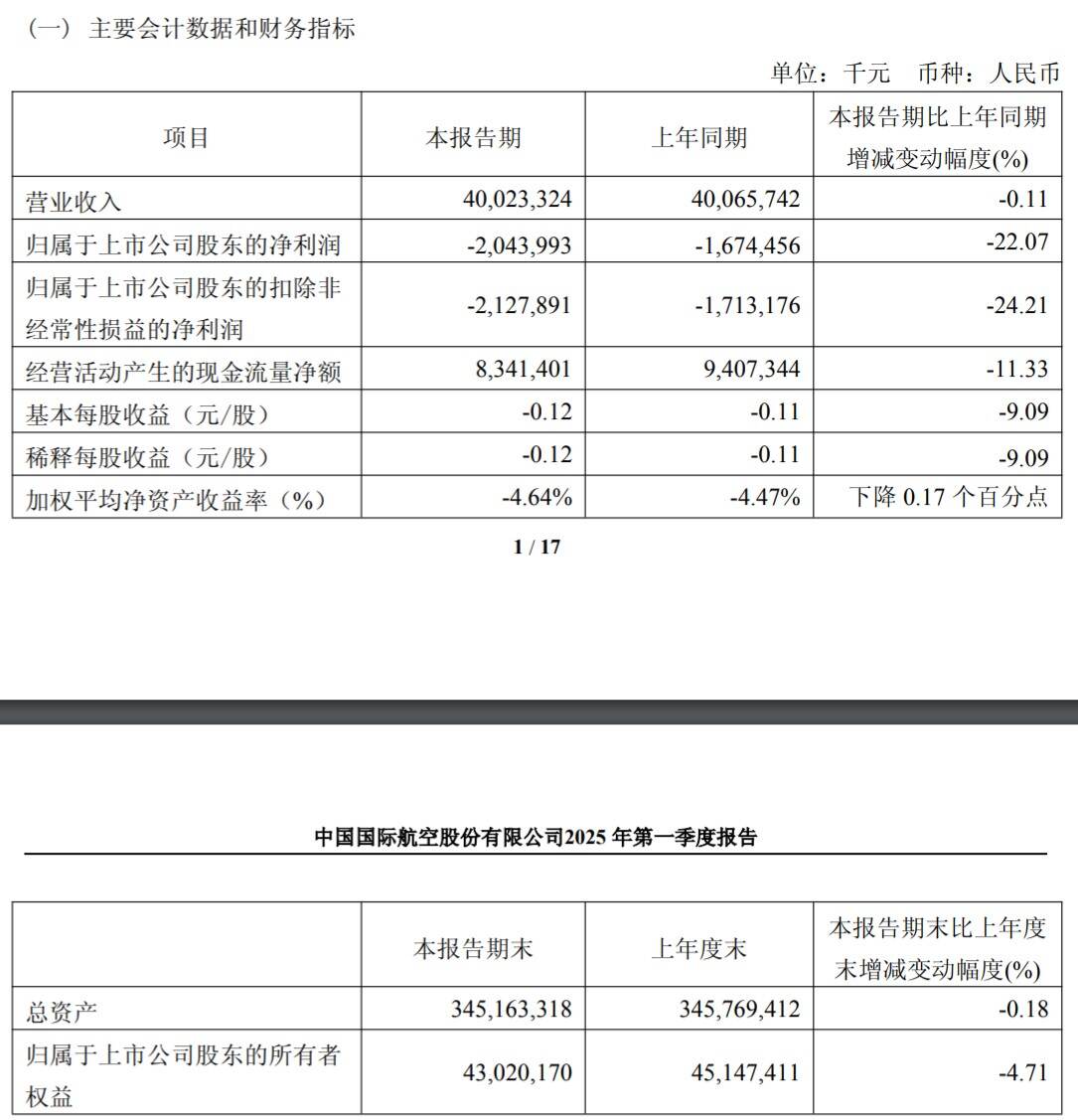 中国国航公告称,2025年第一季度营业收入400.23亿元,较上年同期降0.11%;归属于上市公司股东的净利润为-20.44亿元。