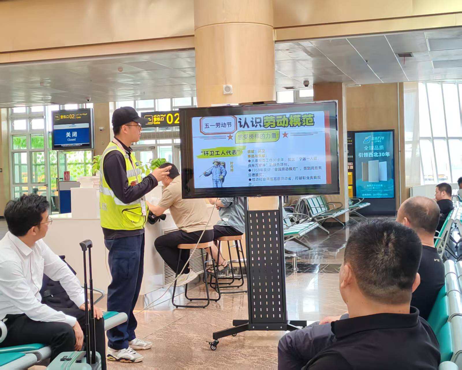 五一国际劳动节来临之际,新疆机场集团克拉玛依机场航站楼内一场弘扬劳动精神的特别活动悄然展开,过往旅客沉浸于劳模故事的动人篇章中。