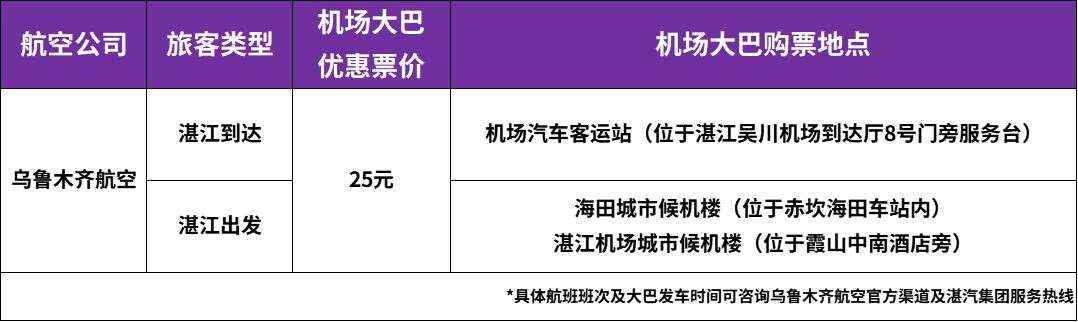 活动期间,所有乘坐乌鲁木齐航空湛江进出港航班的旅客,凭乌鲁木齐航空登机牌或航班购票信息,即可前往湛江机场大巴车线下购票点,以25元优惠票价购买机场大巴车票,轻松往返市区与机场。