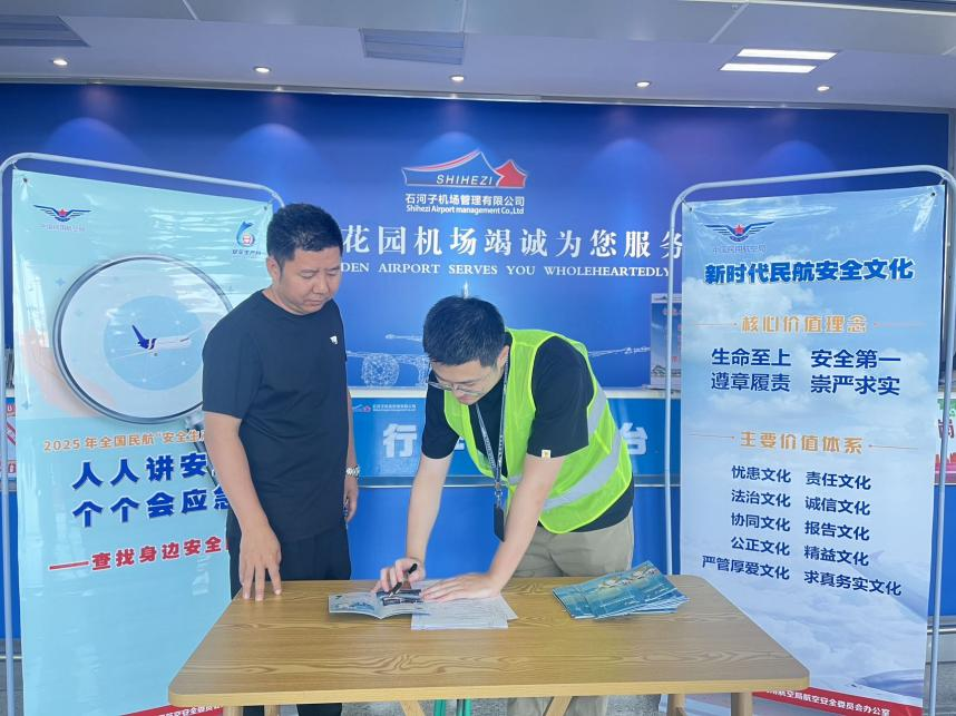 在全国第24个“安全生产月”,“人人讲安全,个个会应急--查找身边安全隐患”的主题深入人心。6月16日,石河子机场安全质量部携手各部门,在候机楼开展了一场别开生面的安全宣传咨询活动,为旅客的出行安全保驾护航。
