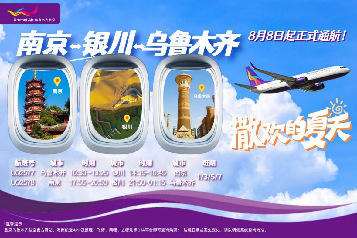 (通讯员 谢承宗)为满足暑运期间日益增长的航空市场需求,促进新疆、宁夏与江苏三地的经贸往来和旅游合作,海航航空集团旗下乌鲁木齐航空于2025年8月8日起,正式开通乌鲁木齐=银川=南京新航线。该航线的开通将进一步织密国内东西部航线网络,为三地旅客提供更加便捷高效的出行选择。