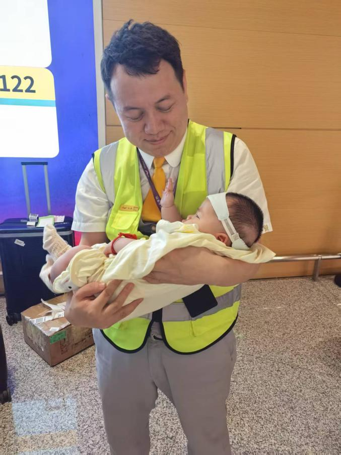 凌晨12点的机场到达厅,夜色正浓。一名女性旅客怀里抱着婴儿,身后还跟着一个孩子,脚步匆匆地来到乌鲁木齐航空行李服务柜台前,略带焦急地说:“你好,可以帮我抱下孩子吗?我要去取行李。”工作人员张磊见状,立刻上前接过那个只有四五个月大的婴儿。尽管毫无带孩子的经验,他还是用略显生疏的姿势小心翼翼地将孩子护在怀中,每一个动作都透着谨慎,生怕有丝毫闪失。
