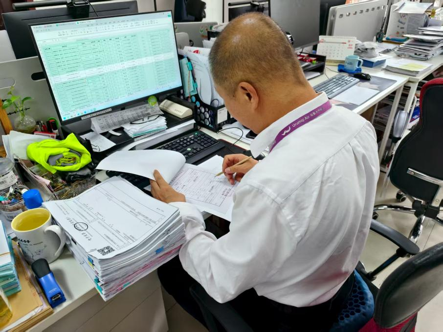 暑运期间,航班量激增、地面保障任务翻倍,费用账单随之“井喷”——从旅客服务的应急支出到酒店费用的结算单据,从合作单位的协作费用到日常运营的琐碎开销,每一份账单都关系着成本的合理合规。作为审批环节的关键一环,陈军深知肩上的责任:既要快,确保账单及时核销不耽误一线保障;更要准,杜绝不合理支出,把每一分钱都用在刀刃上。