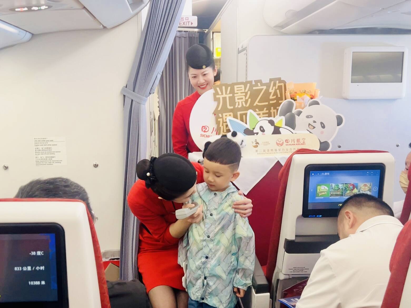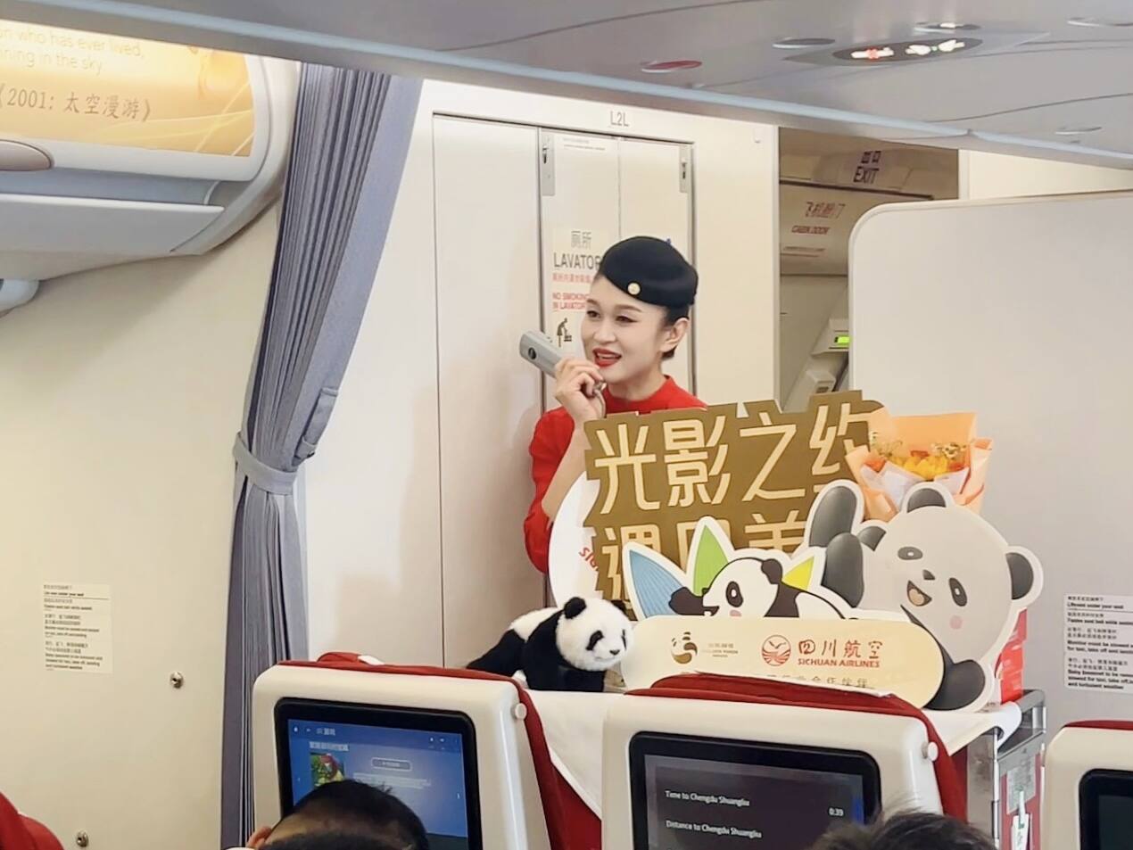 9月12日,川航分别携手央视新闻、金熊猫奖组委会,在北京首都至成都双流航线上,打造3U8884“中国电影消费年”及3U8886“金熊猫云影号”特色主题航班。川航不但在这两个航班上进行电影特色氛围布置,还在飞行途中播放明星口播、开展电影电视知识问答活动,与旅客趣味互动。