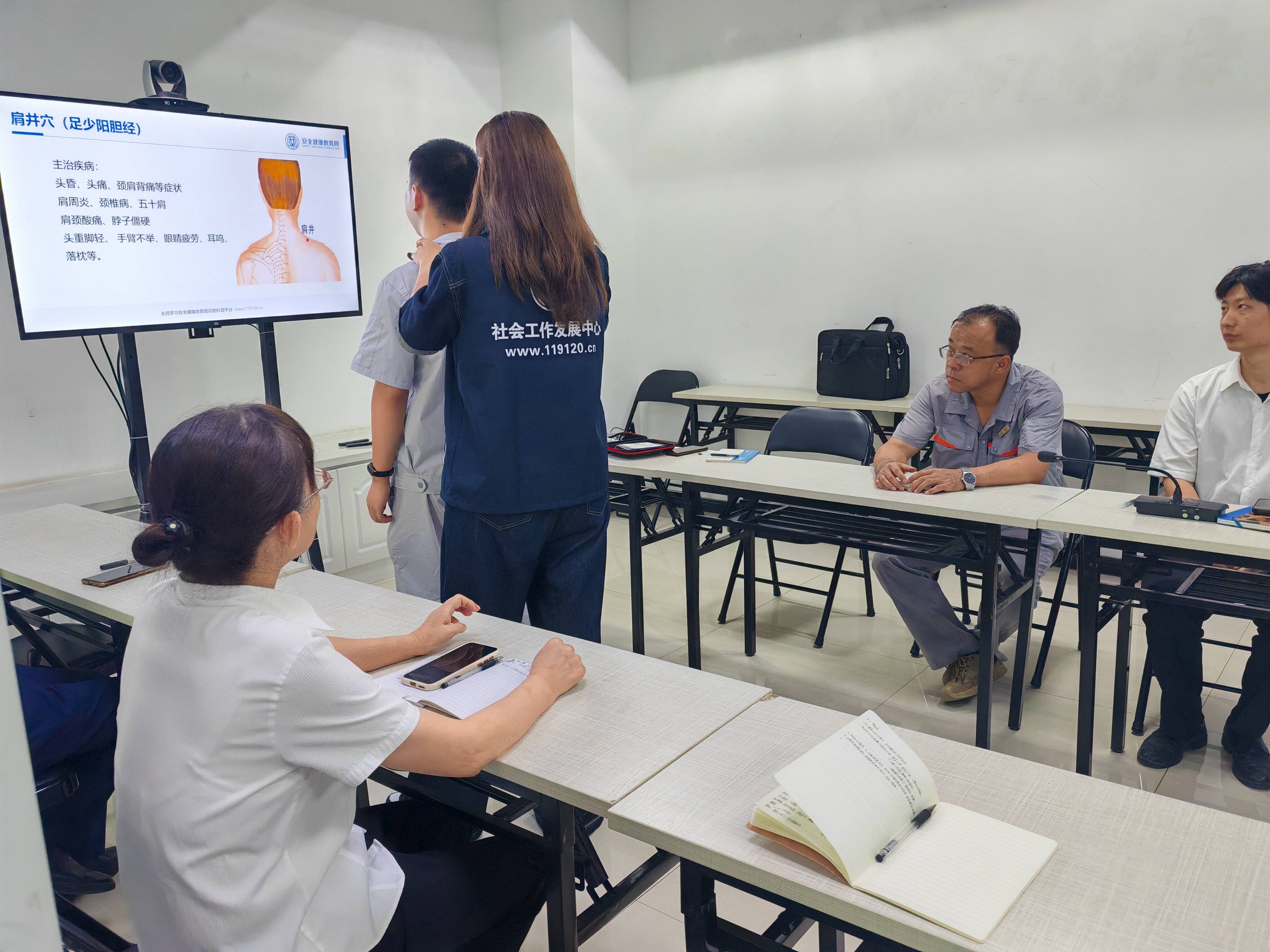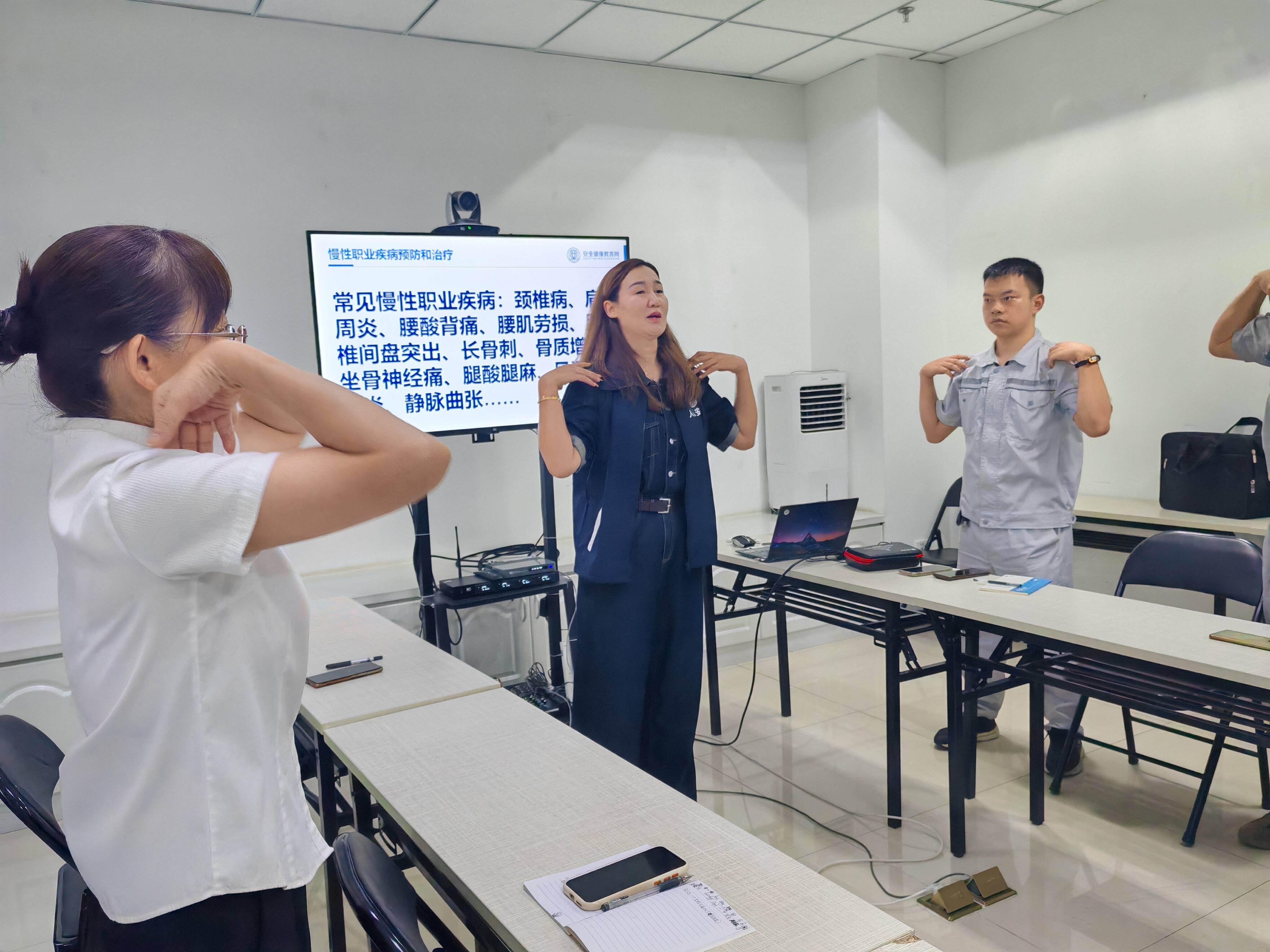 讲座中,专家讲师围绕职场高发健康问题展开系统讲解。针对突发卫生事故,重点演示了CPR心肺复苏术,并邀请员工现场练习,逐一纠正动作细节,强化应急反应能力;围绕健康体重管理,结合“三减三健”理念与《中国居民膳食指南》,剖析了久坐人群的饮食误区与运动建议,倡导科学减重、均衡营养;针对肩周炎、颈椎病、腰椎间盘突出等慢性病及“四高”防治,通过案例分析、数据解读等方式,普及疾病早期症状与干预手段,并现场教授“颈椎操”“穴位按摩”等简易缓解方法。
