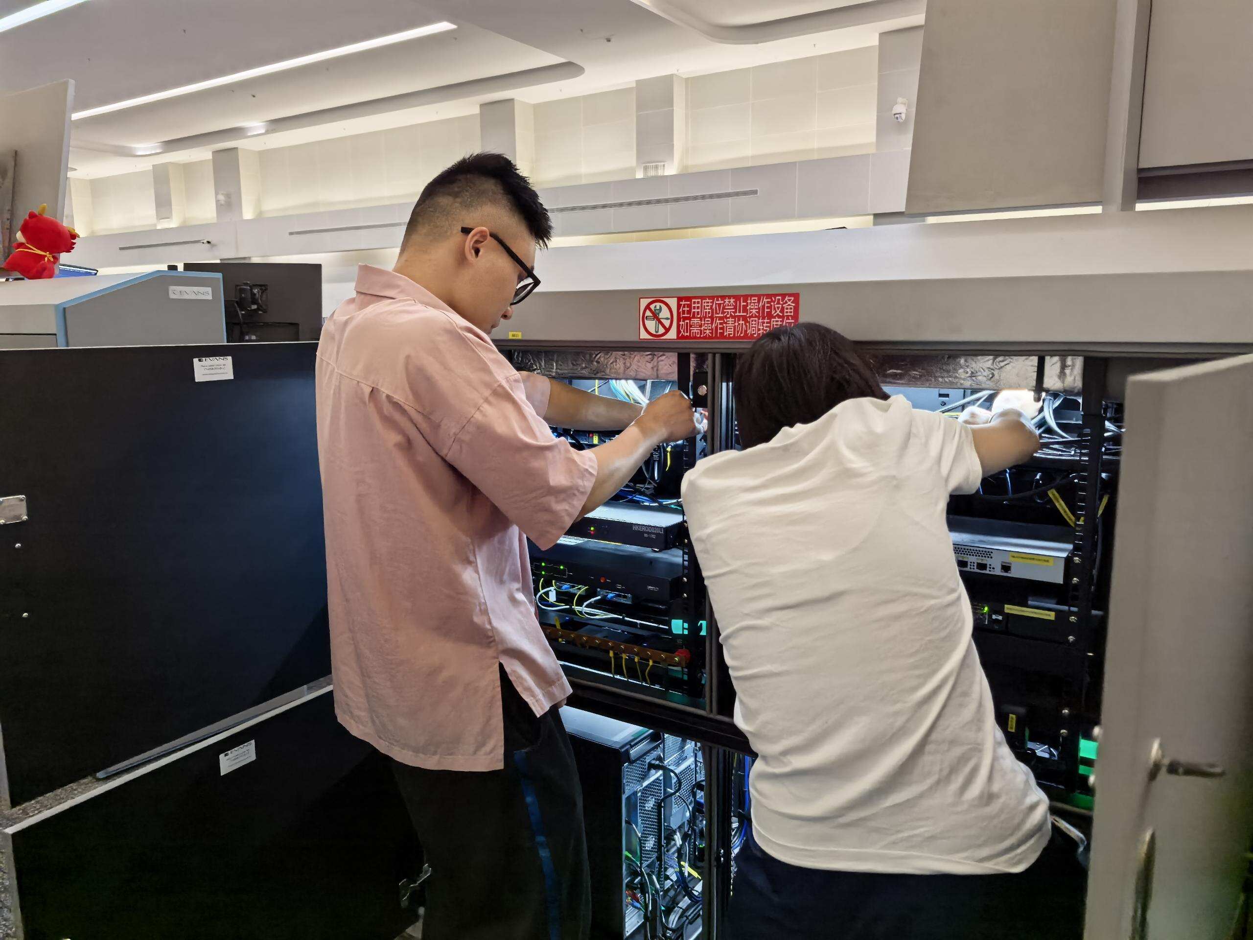 区管管制席位调整工作主要涉及S模式空地协同预警系统、内话以及甚高频遥控盒等多种设备,调整内容需同步兼顾设备硬件运行的可行性、软件适配的兼容性。为确保管制现场运行安全,技术保障部成立技术小组,对调整实施方案进行研讨,确保施工快速且高效。管制席位施工空间狭小,席位设备调整是一项艰巨而复杂的工作。拆装视频线、电源和设备网线等均需要在机柜背后操作,技术人员需蜷缩身体才能正常进行施工。实施过程中,运行保障室技术人员紧密协作,严格遵循既定实施步骤,稳步有序推进完成席位调整工作。