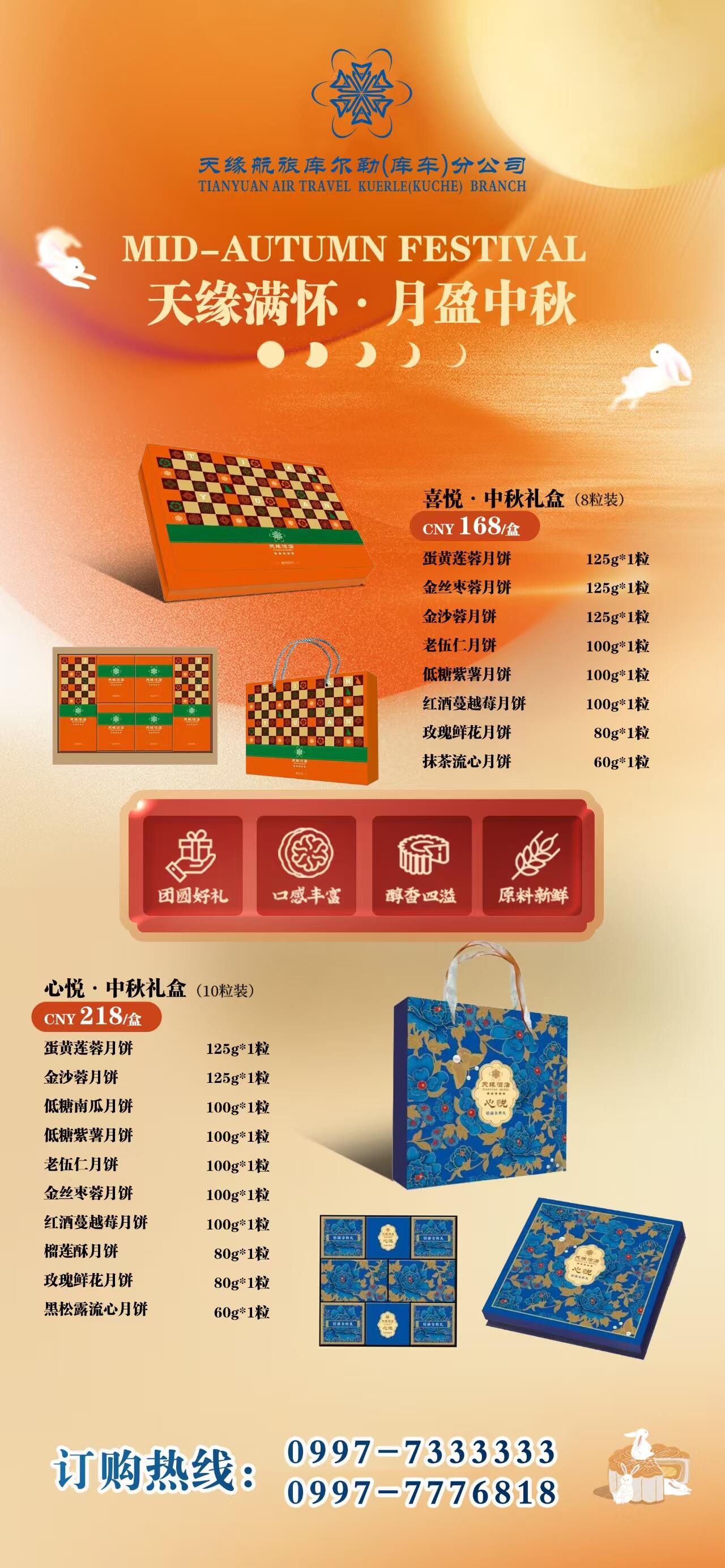 即日起,中秋礼盒已开启预售,诚为家庭欢聚添彩,亦是企业福利佳选。广大宾客可拨打订购热线0997-7333333或0997-7776818进行电话预订,或亲临天缘航旅库尔勒(库车)分公司各经营单位门店选购。早订早享,确保浓情佳礼如期抵达。